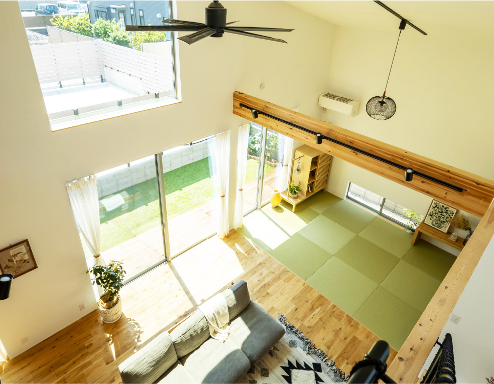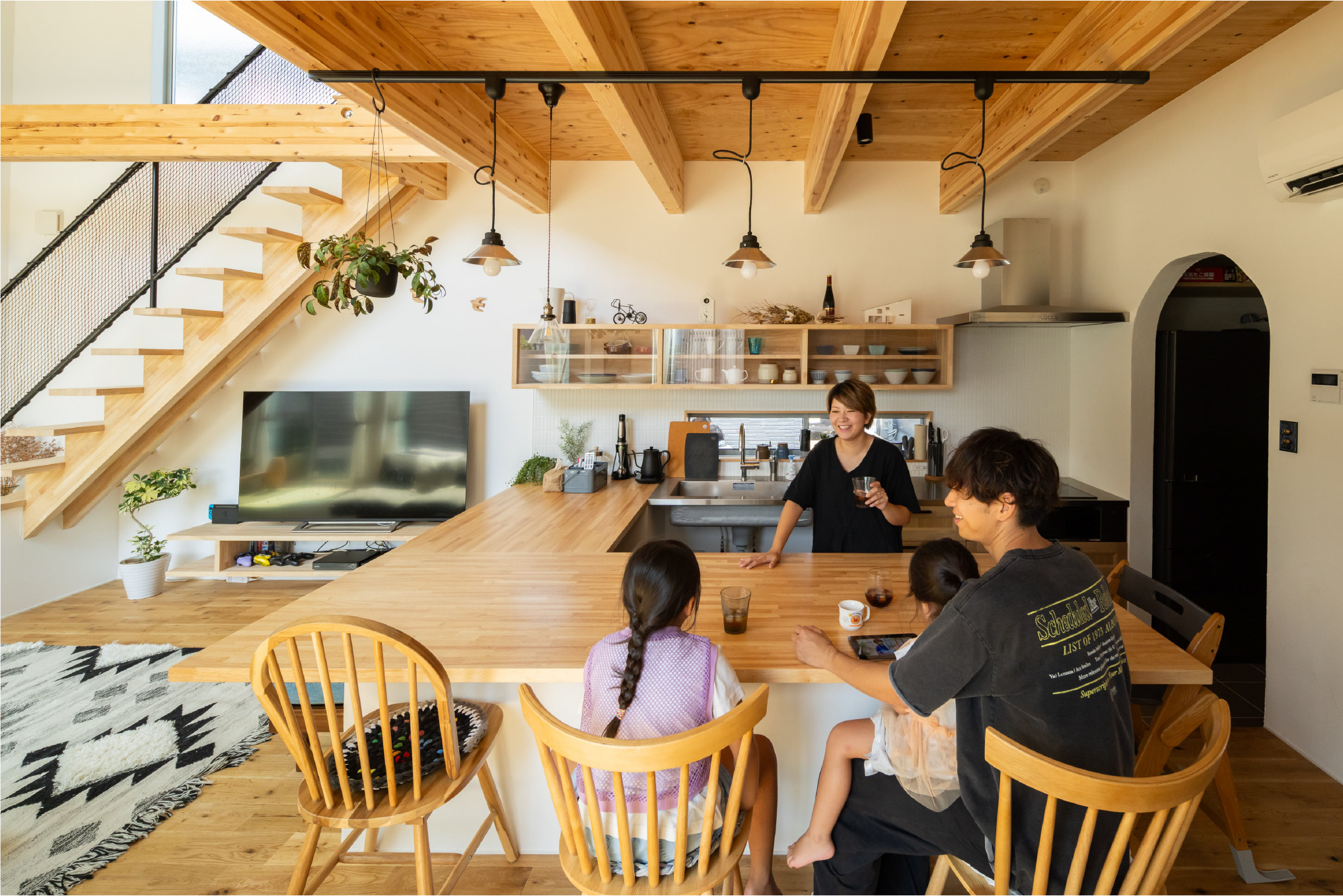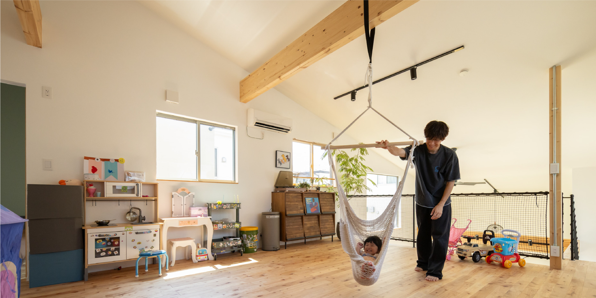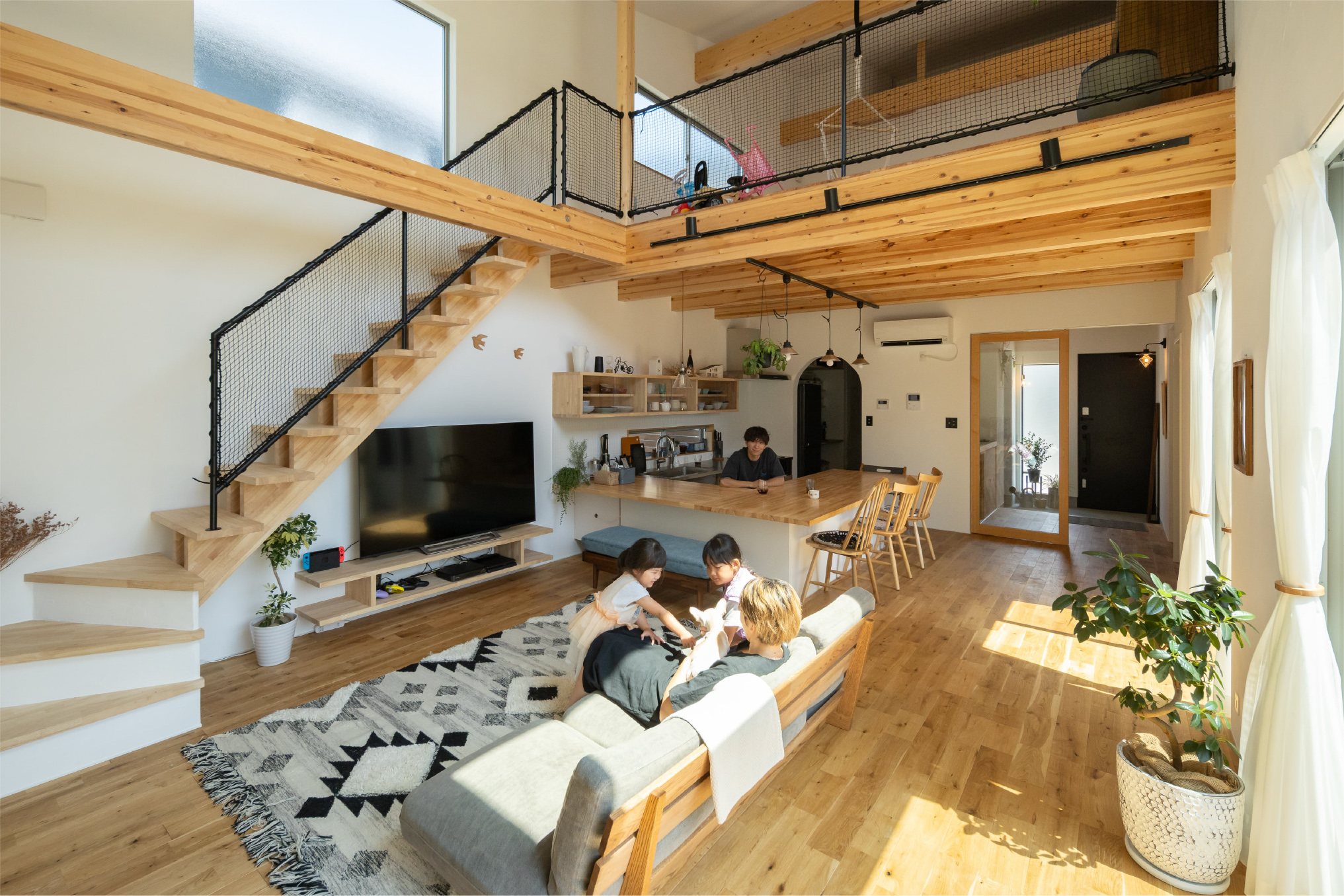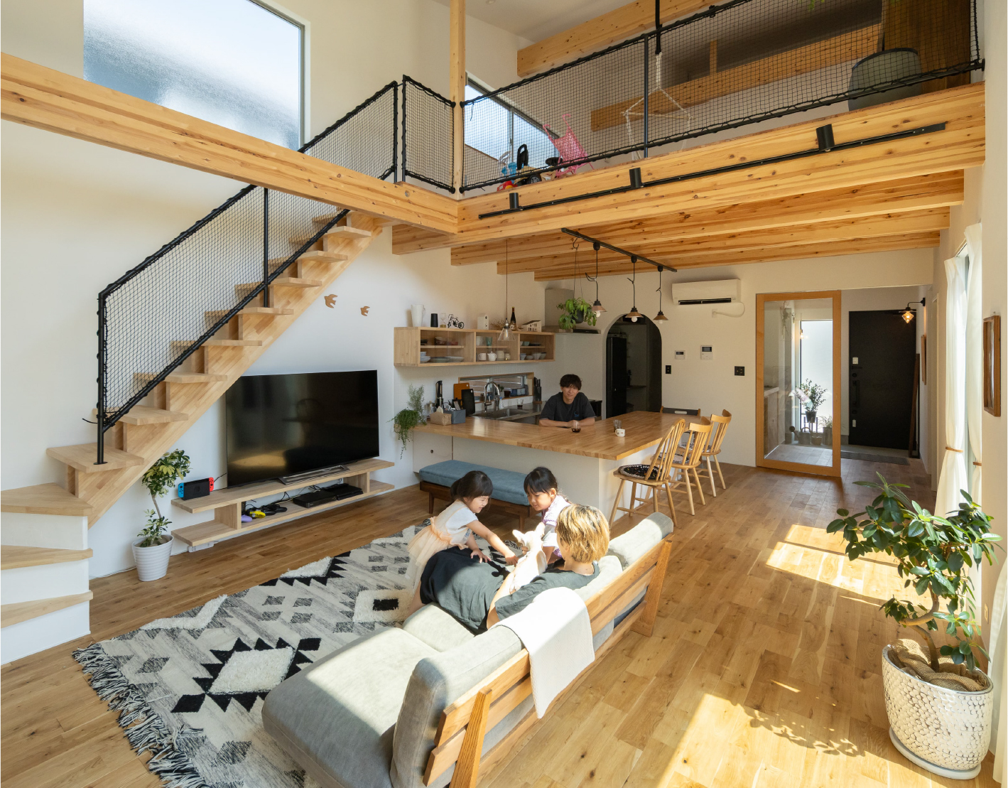 駅前の狭小住宅からの住替えのお客様です。前の住宅の反省を踏まえて、子供たちが走り回れる広くて明るいリビングと中庭を設けました。また子供部屋の間仕切りを無くす事で(時期が来たら施工)、2階も大きな遊び場になっております。また玄関正面は窓をなくし、プライバシーを配慮しつつ中庭を大きくとることで、室内は明るくて開放的な空間になりました。