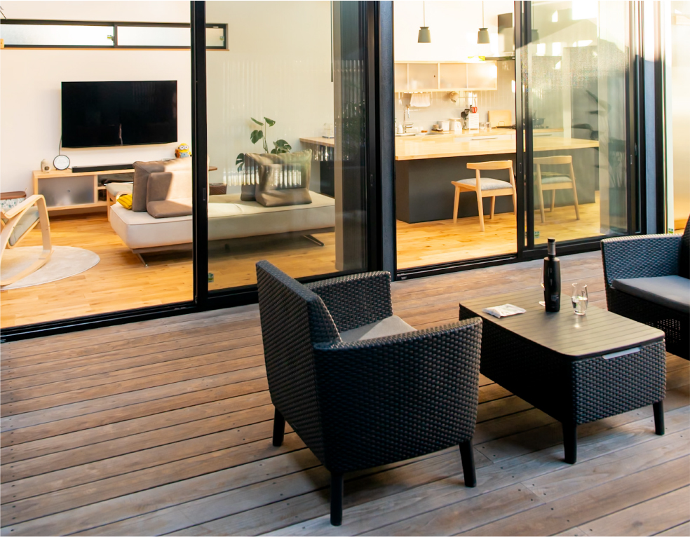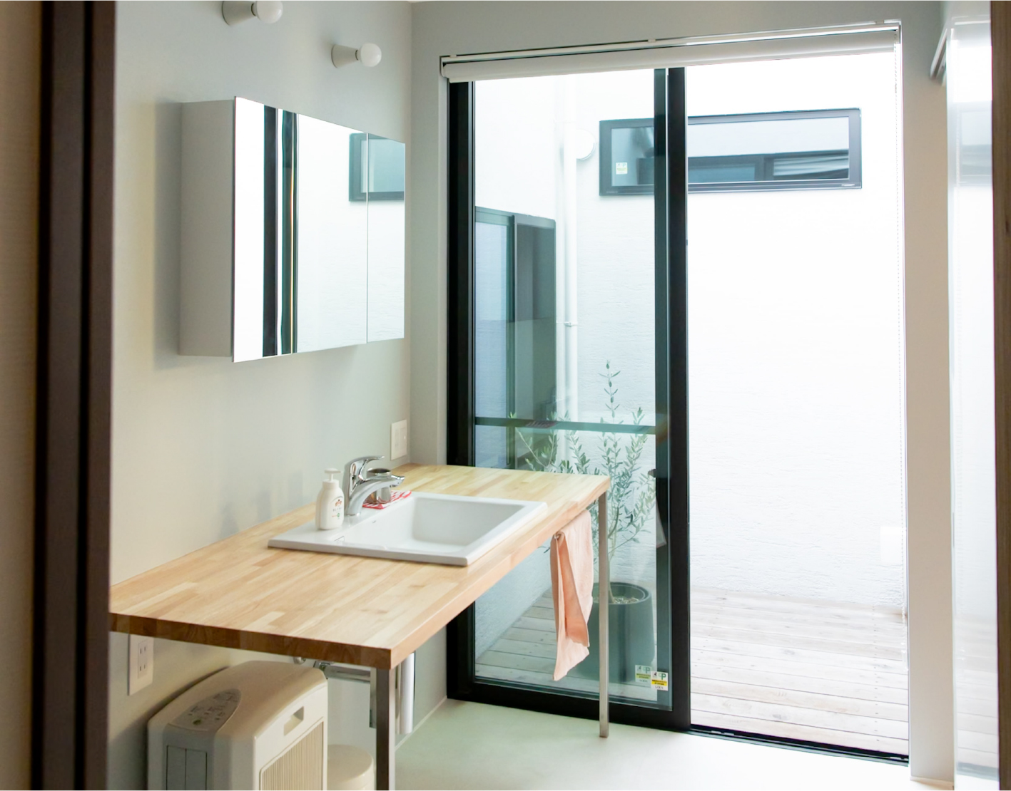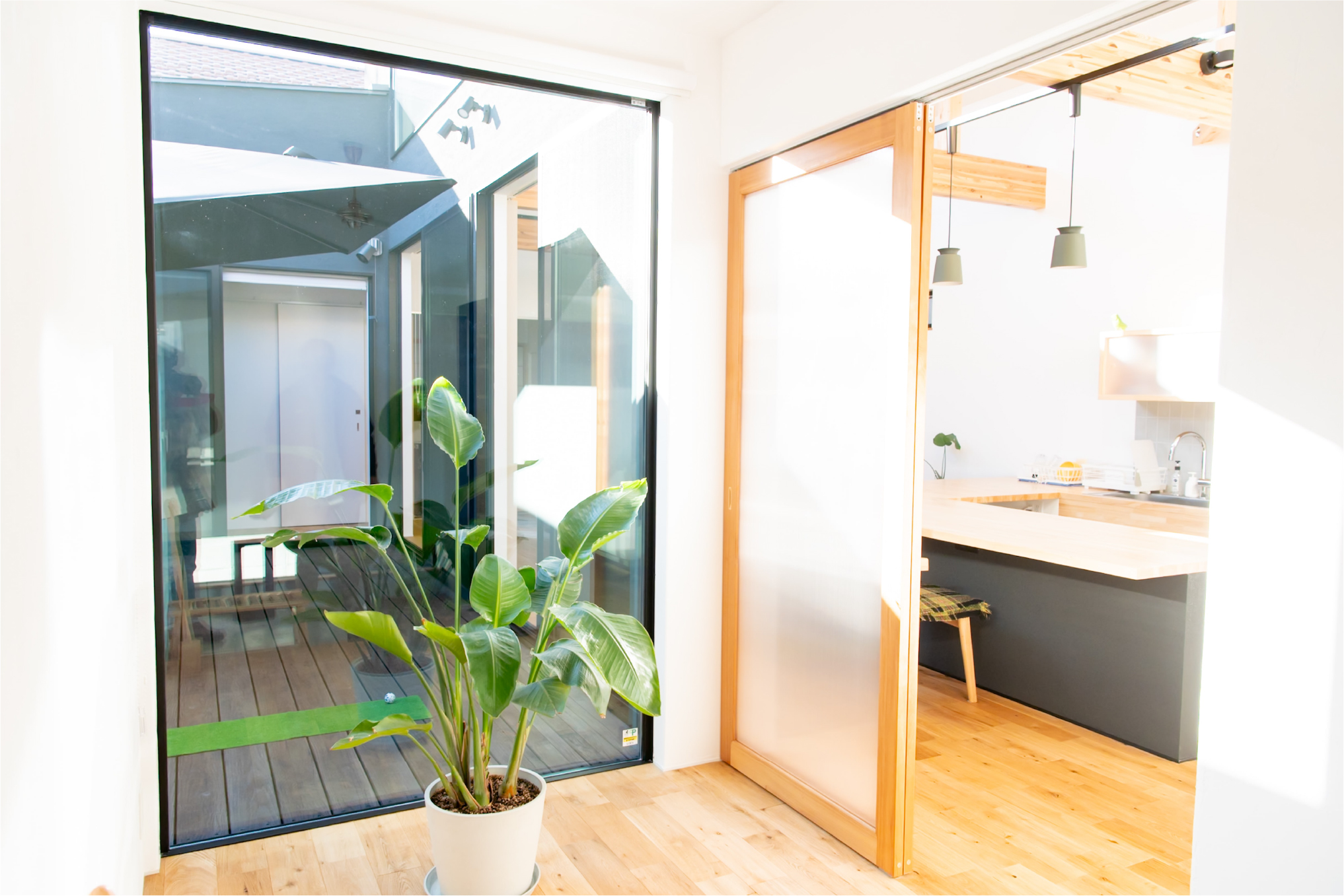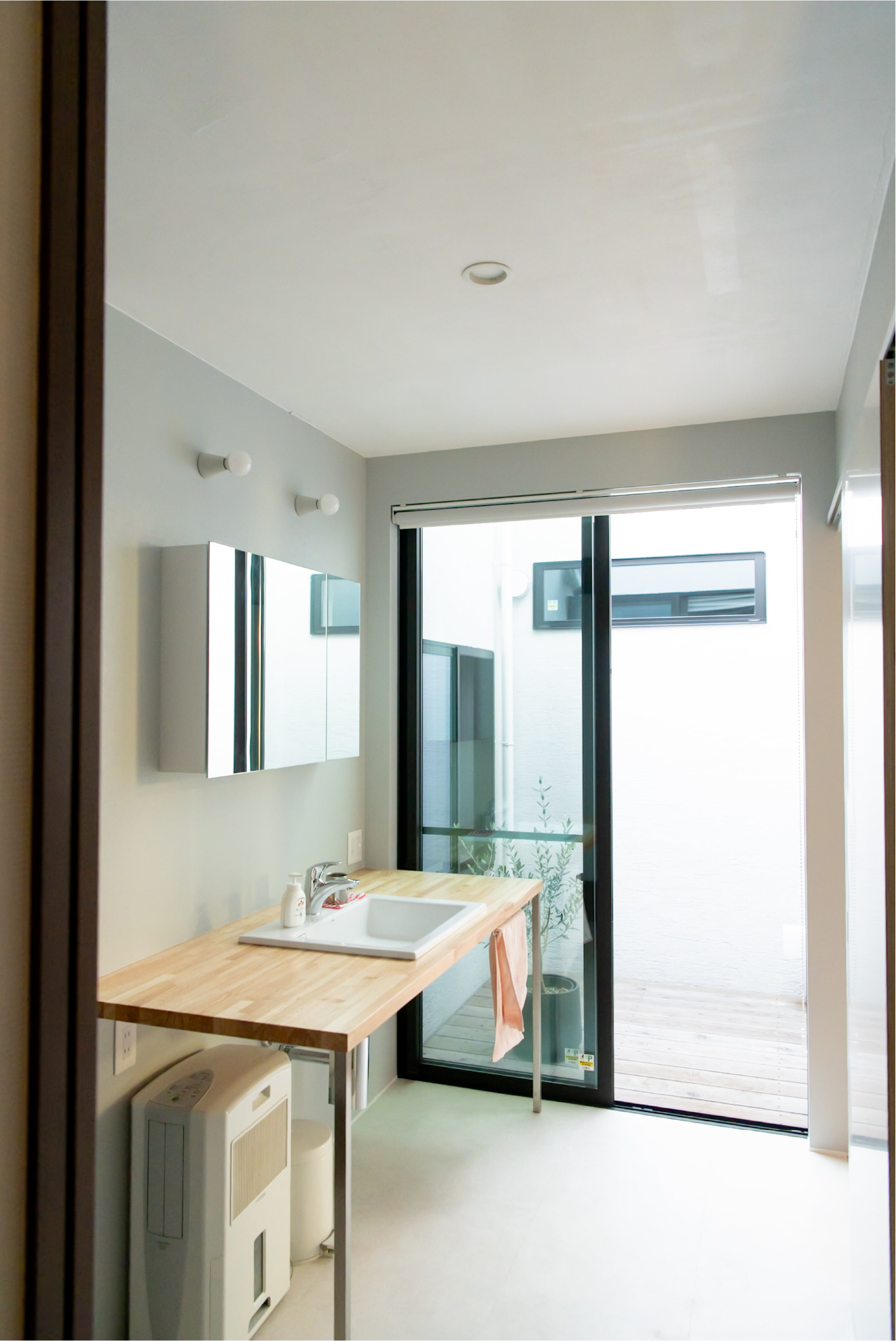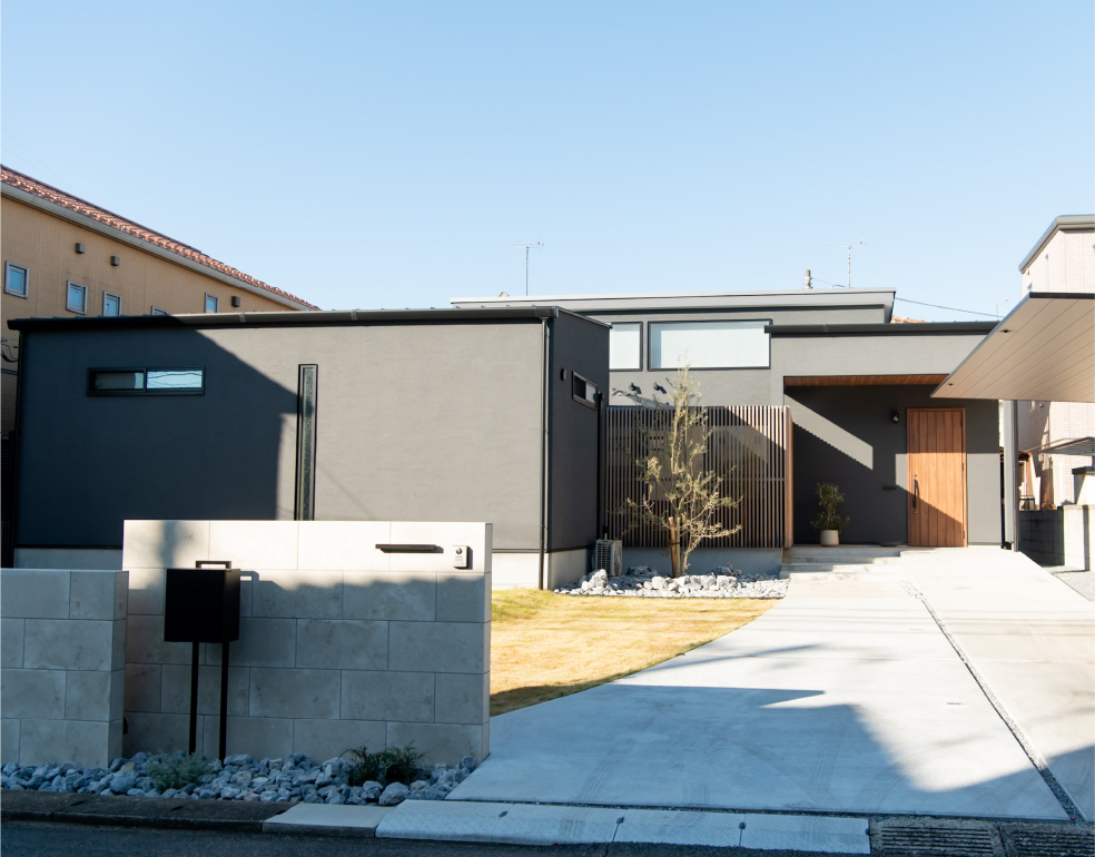 格子で外とつながる大きな中庭と、家の奥に小さな坪にはと二つ設けました。大きな中庭はリビングや寝室に面して、一体感のある明るく解放的な空間になりました。小さな中庭はお風呂や洗面所に面し、プライバシーを保ちつつ外を感じられる空間になっています。また夫婦二人暮らしのために、水回りと寝室をつなげることで、コンパクトで使いやすい回遊動線になりました。