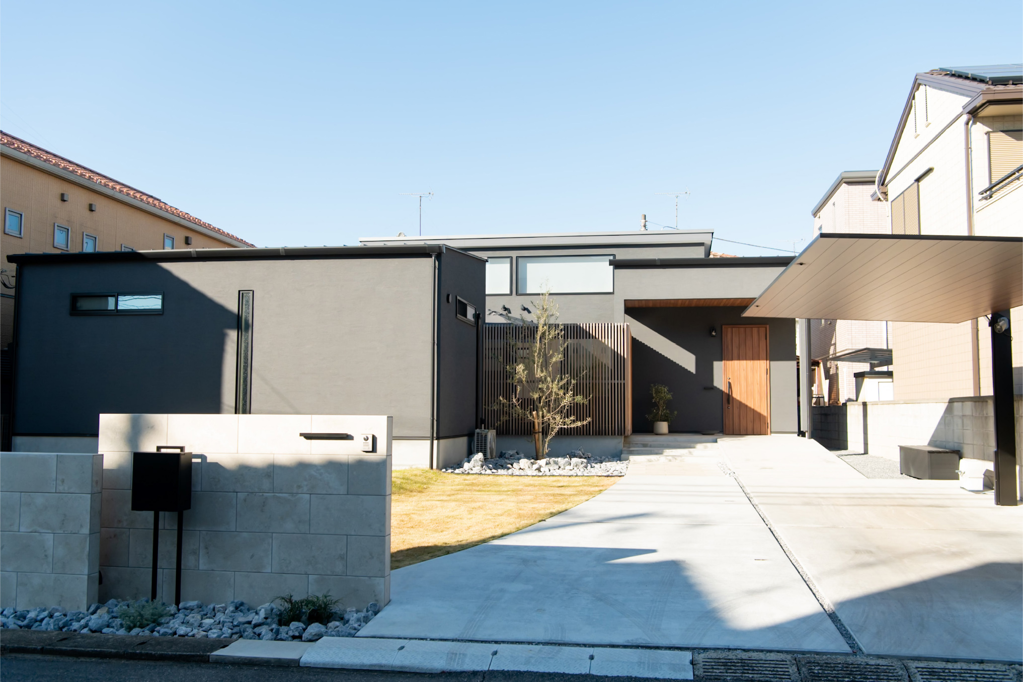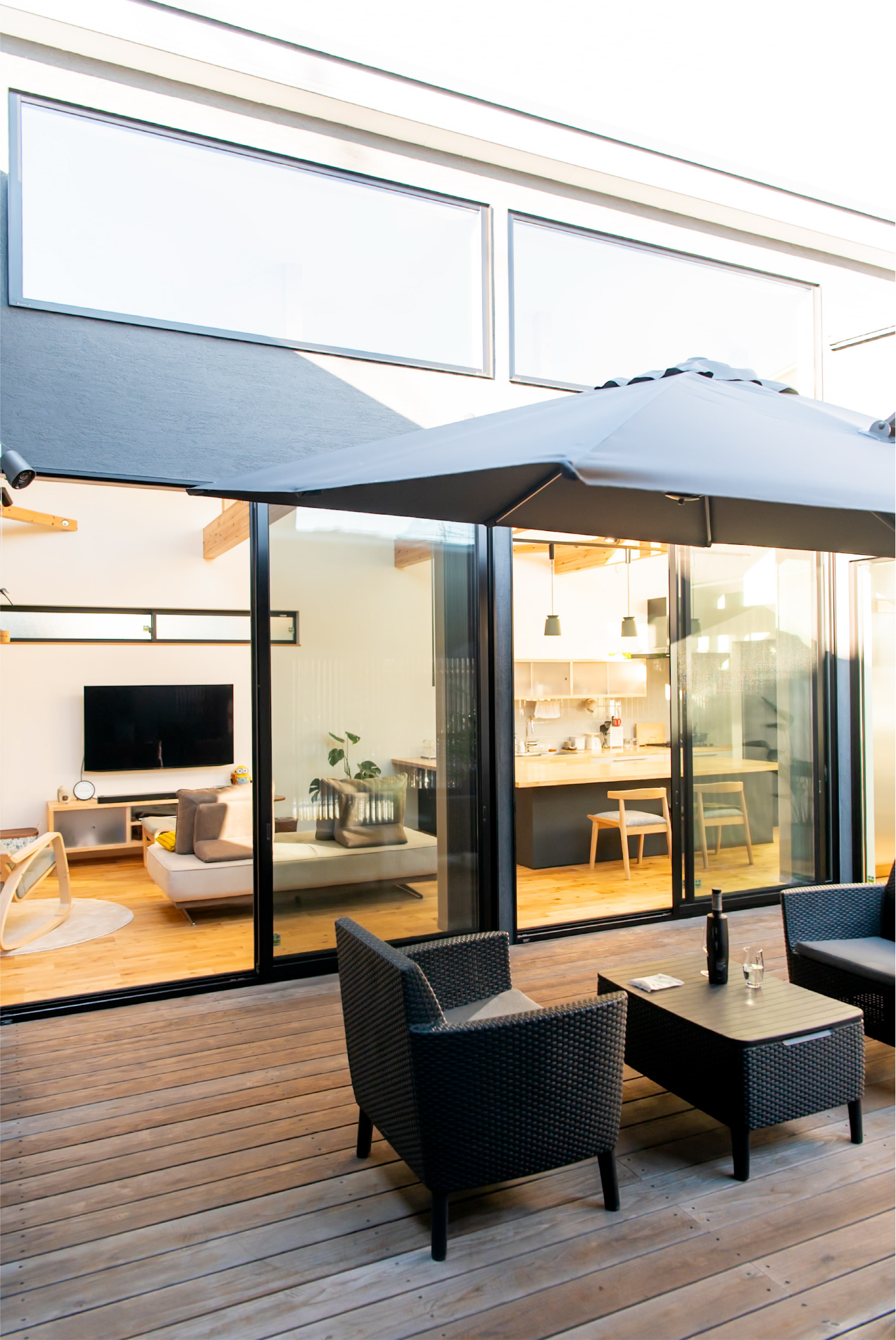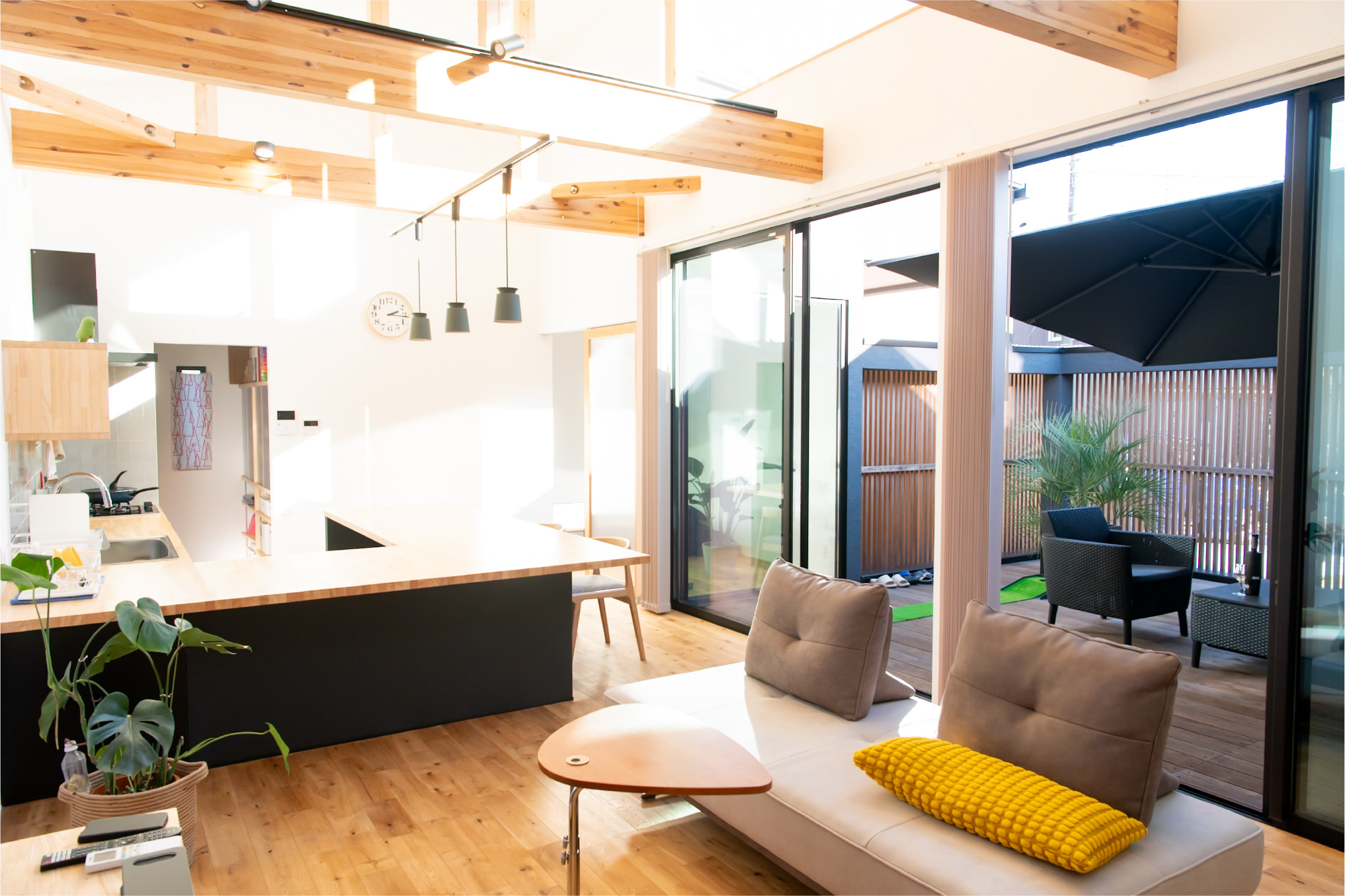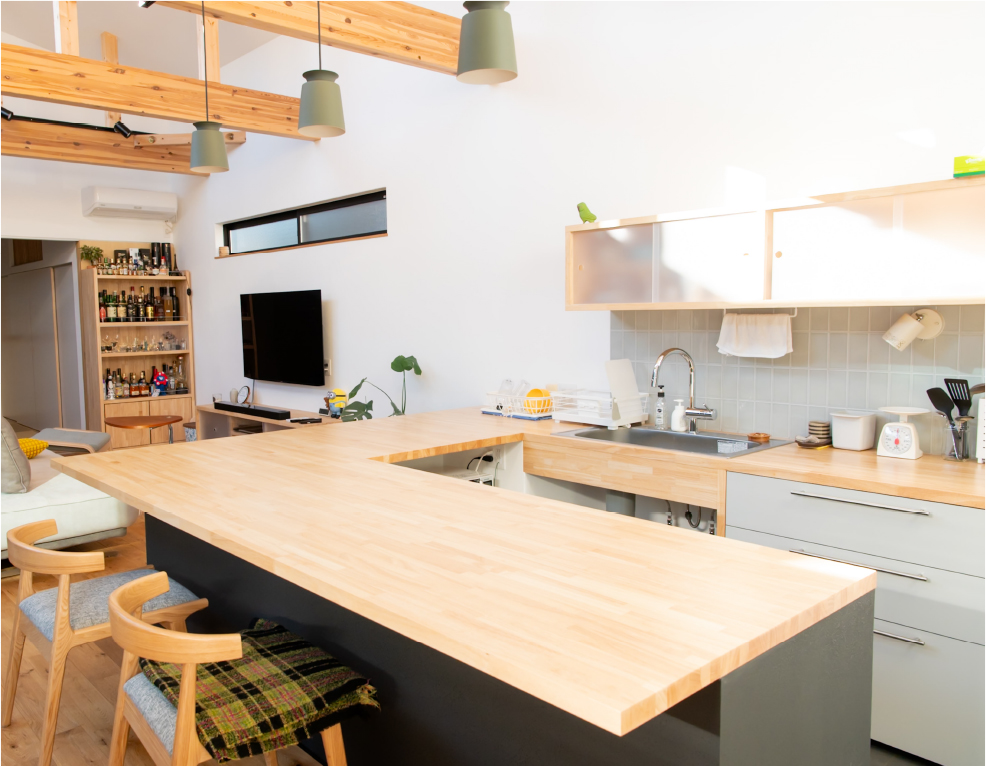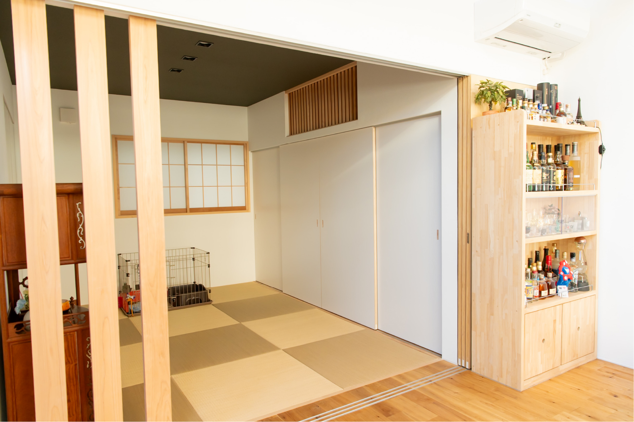 格子で外とつながる大きな中庭と、家の奥に小さな坪にはと二つ設けました。大きな中庭はリビングや寝室に面して、一体感のある明るく解放的な空間になりました。小さな中庭はお風呂や洗面所に面し、プライバシーを保ちつつ外を感じられる空間になっています。また夫婦二人暮らしのために、水回りと寝室をつなげることで、コンパクトで使いやすい回遊動線になりました。