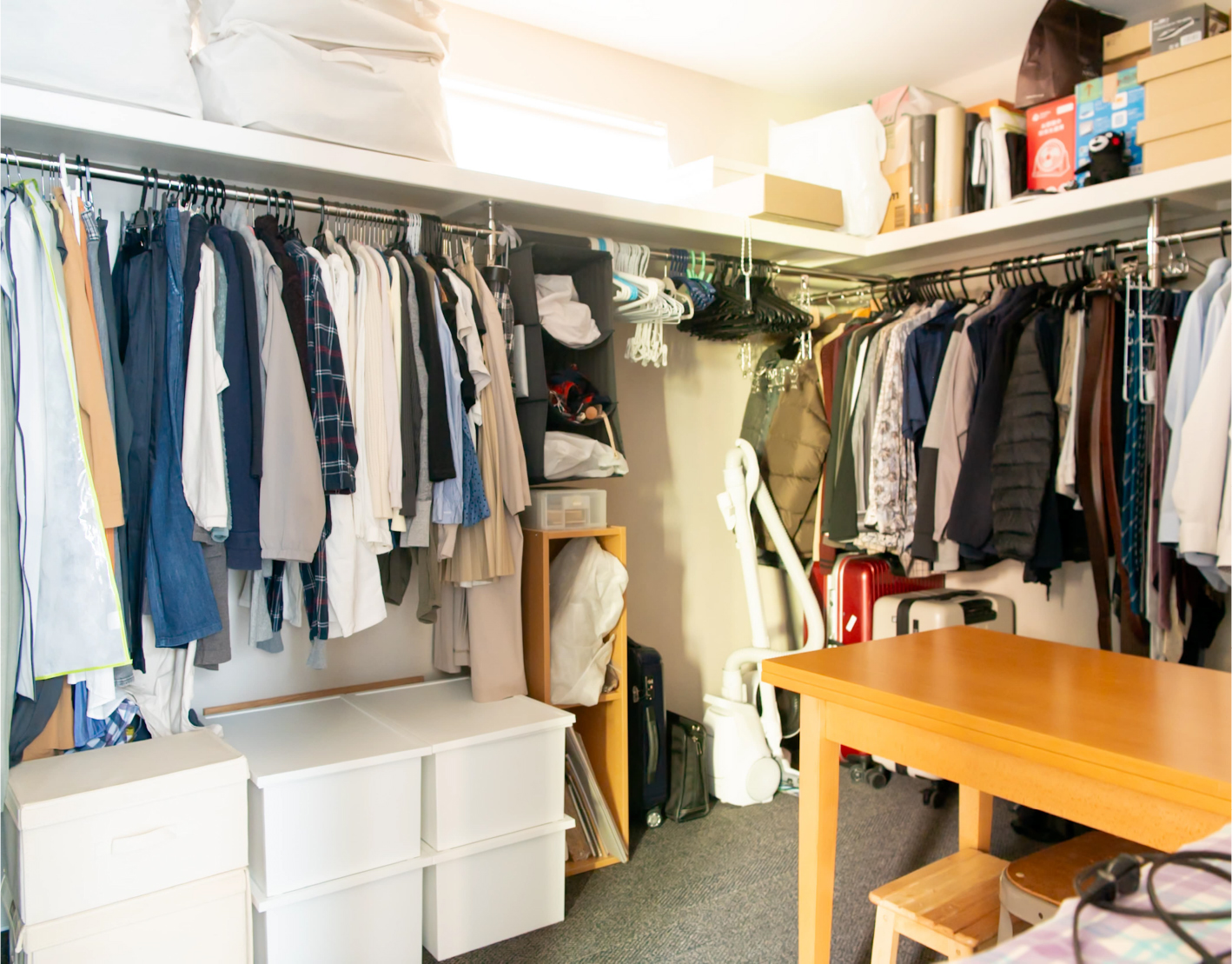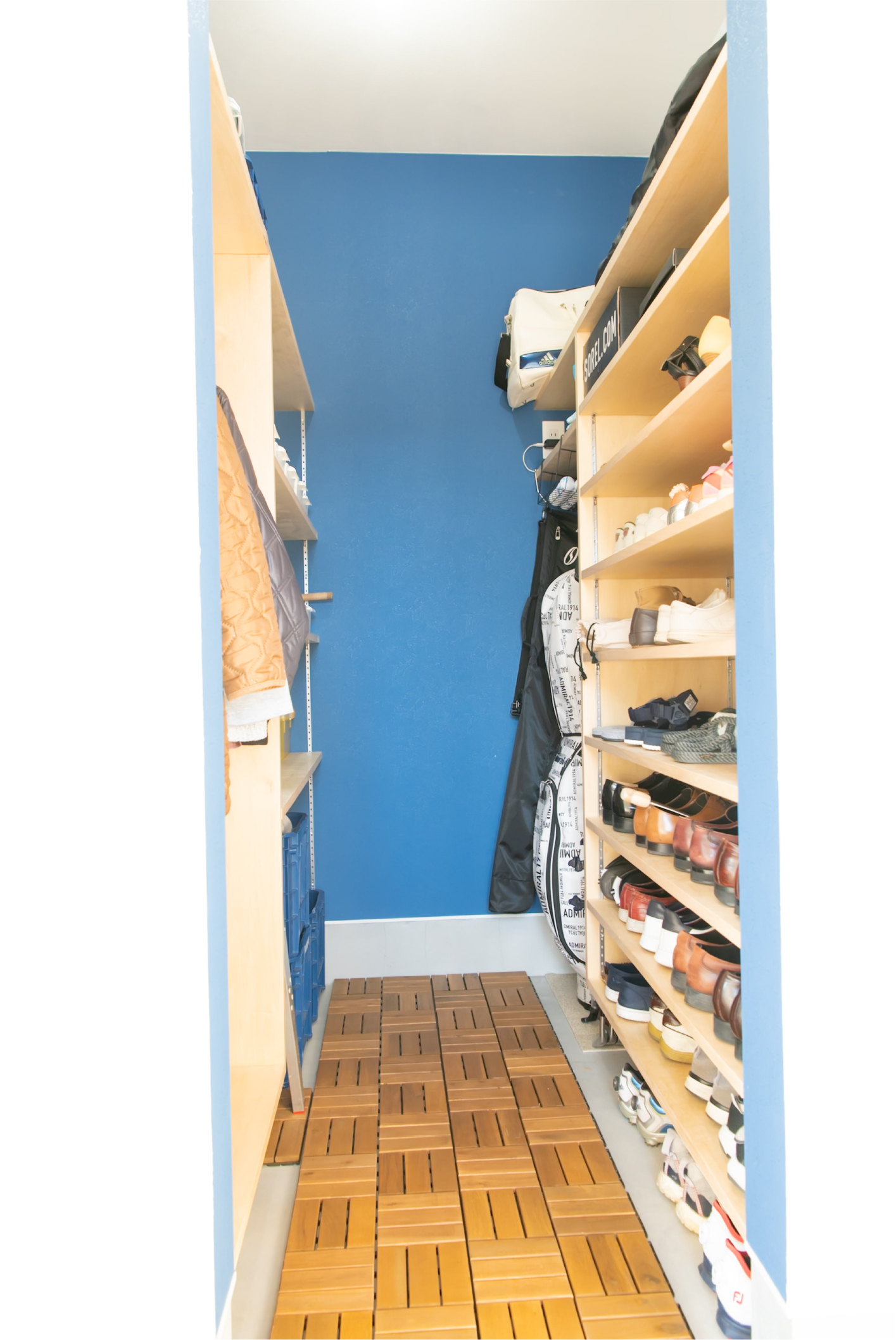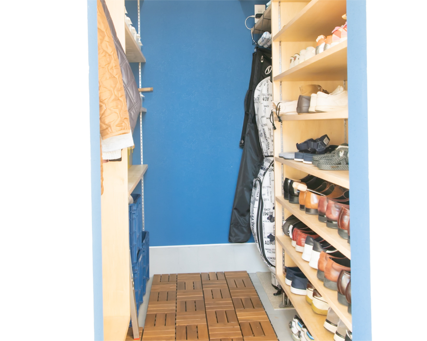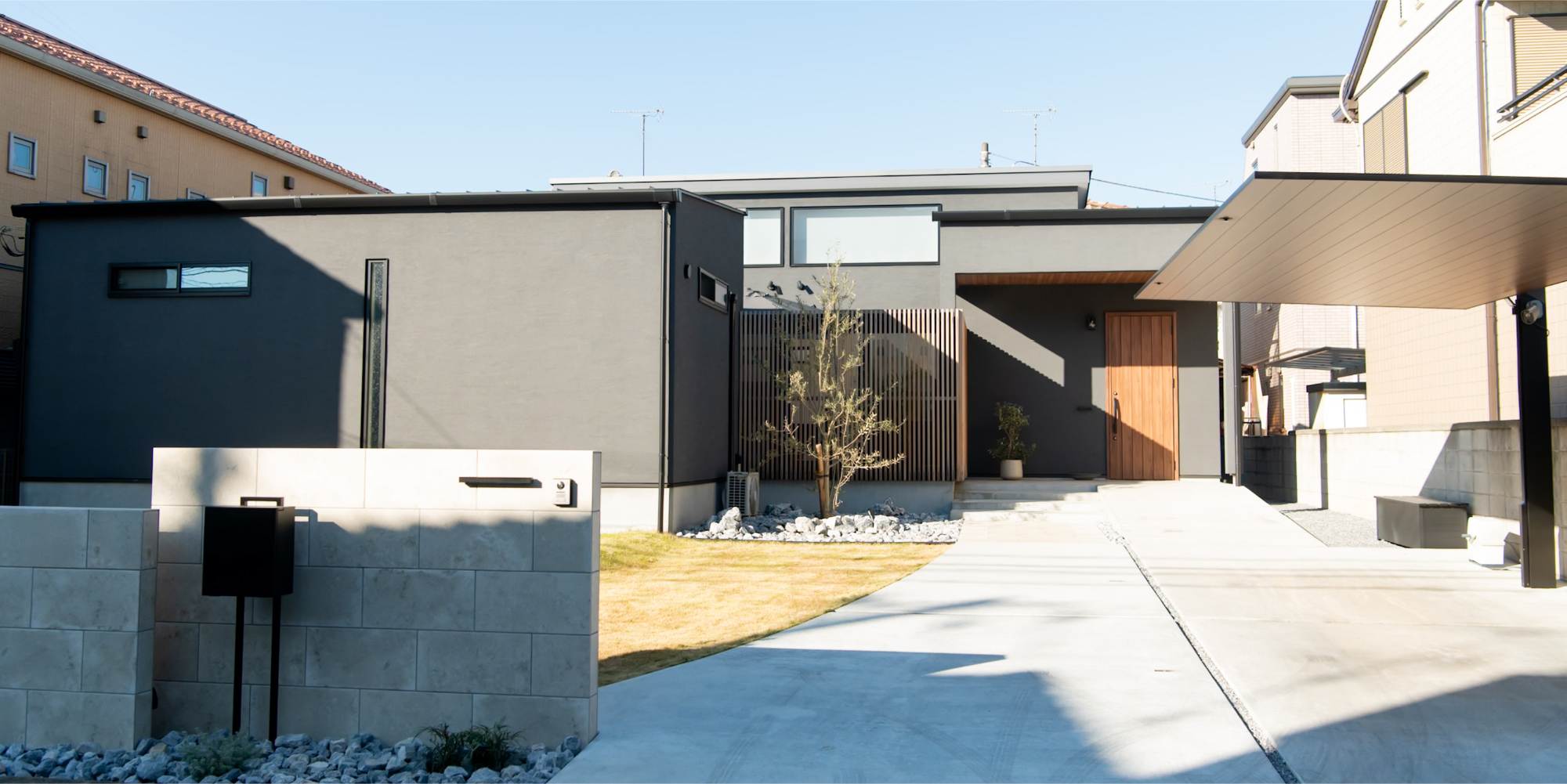 格子で外とつながる大きな中庭と、家の奥に小さな坪にはと二つ設けました。大きな中庭はリビングや寝室に面して、一体感のある明るく解放的な空間になりました。小さな中庭はお風呂や洗面所に面し、プライバシーを保ちつつ外を感じられる空間になっています。また夫婦二人暮らしのために、水回りと寝室をつなげることで、コンパクトで使いやすい回遊動線になりました。