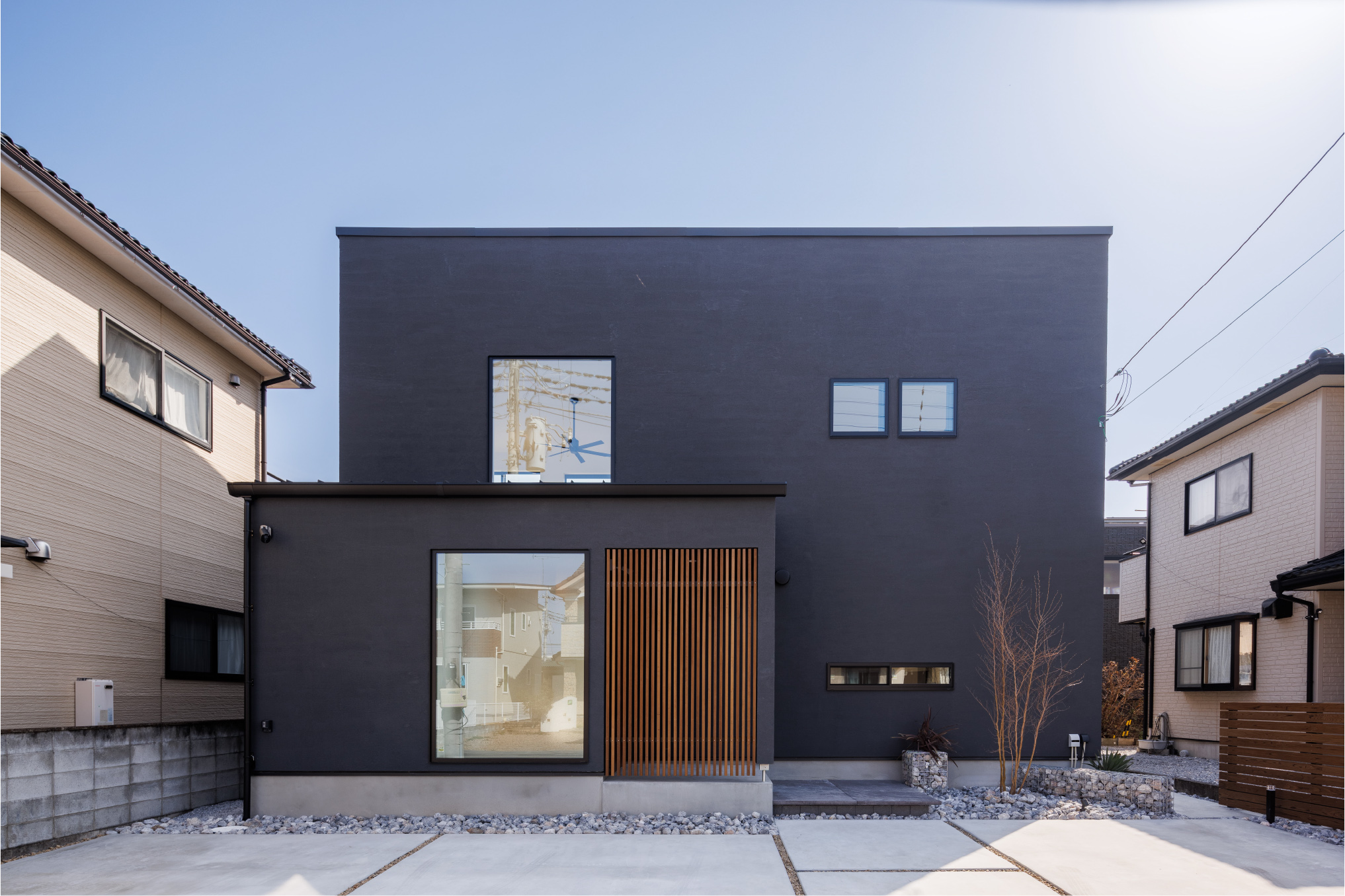 ブラックの塗り壁に木製格子を組み合わせた外観。