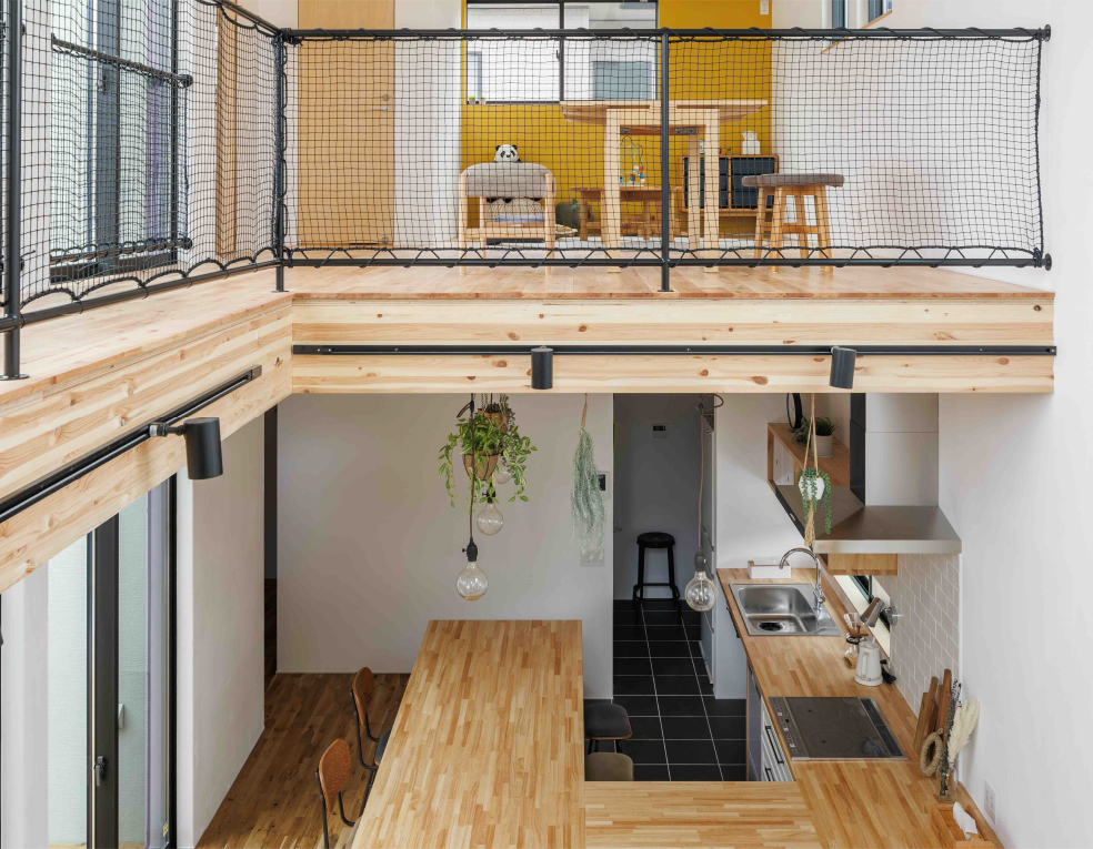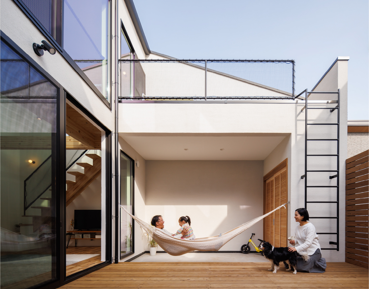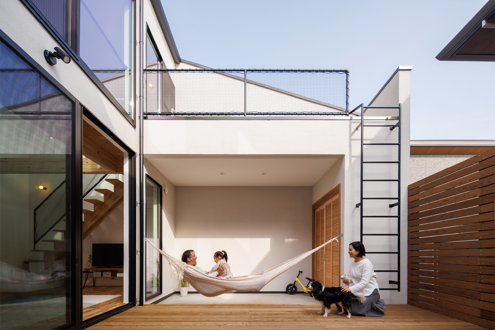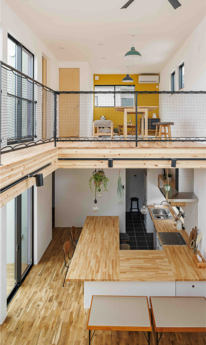中庭をコの字に囲む間取りで、住宅街でも周囲の視線を気にすることなく、外との繋がりや開放感を感じられます。