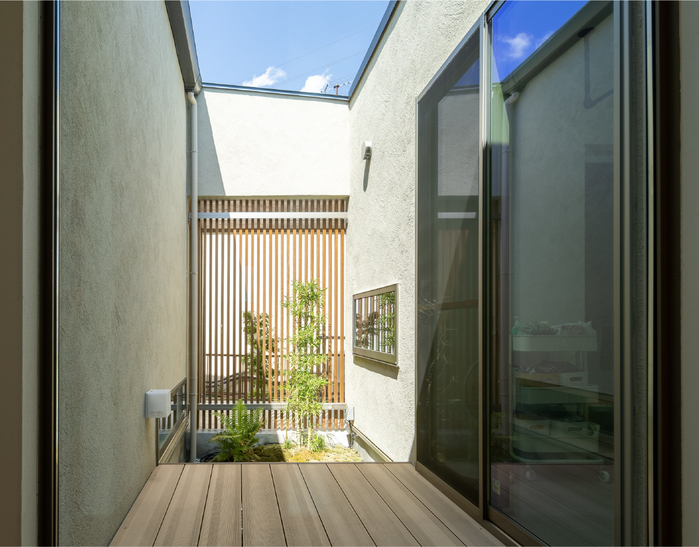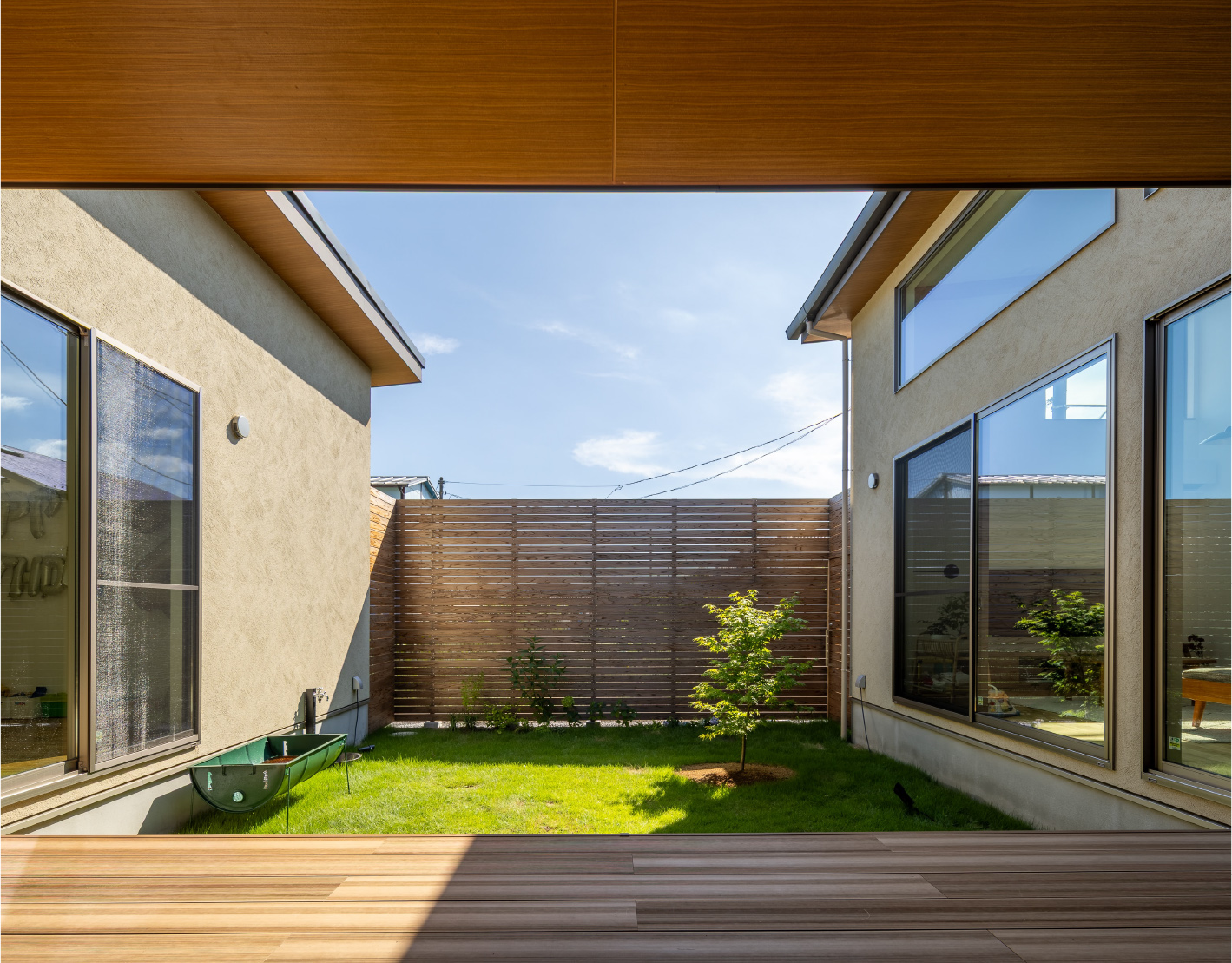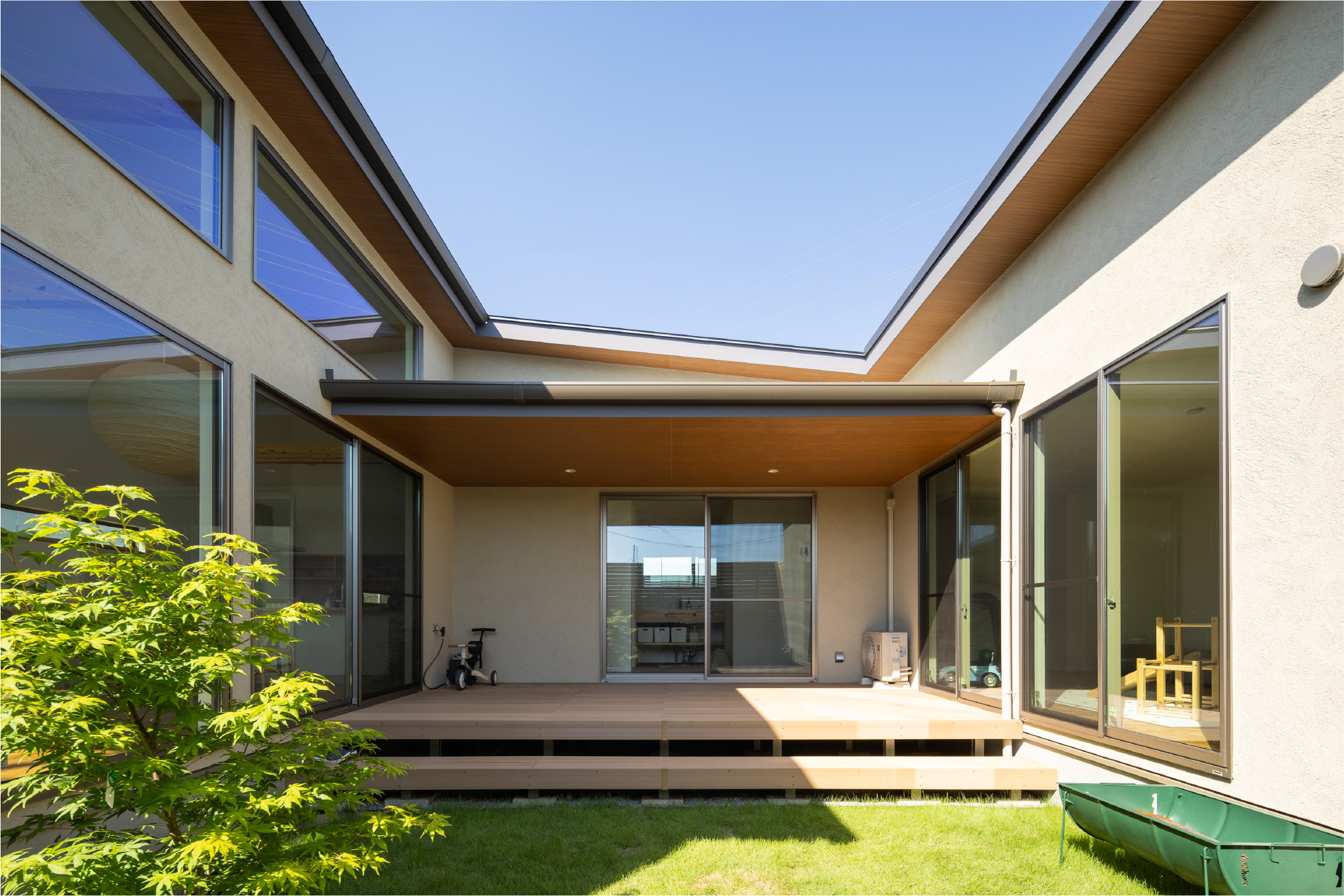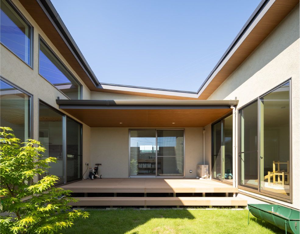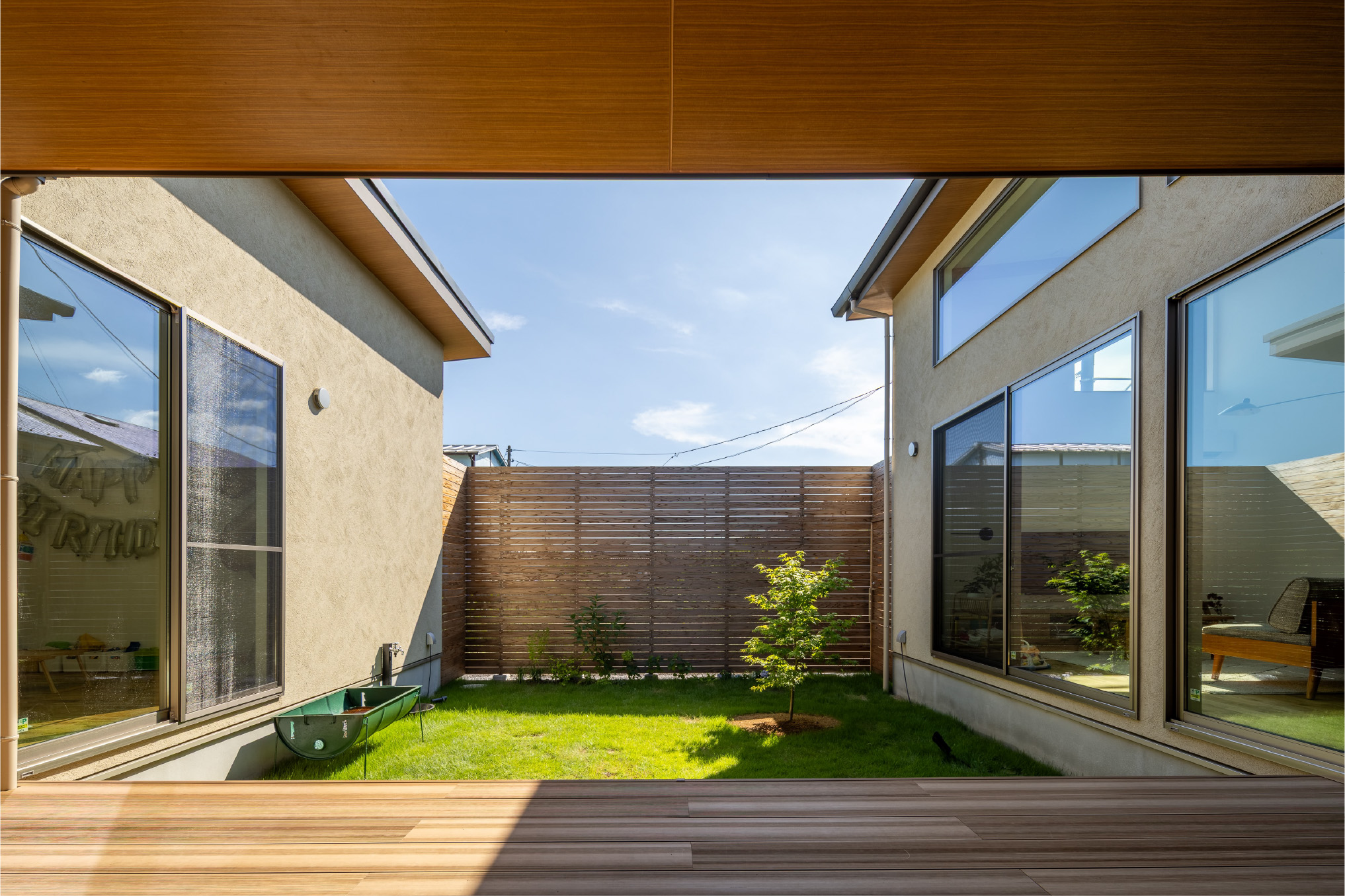 玄関近くの見て楽しめる小さな坪庭と、リビング横の子供が遊べる大きな中庭と、2つの中庭を設けました。それぞれの中庭の周りに色々な部屋を設けることで、どこからでも明るく開放的な空間になりました。ウッドデッキと土と半々の広い中庭には、大きな下屋(屋根)を作ることで夏の日差しを抑えつつ、雨の日でも洗濯物などを気にせず使える空間になっています。
