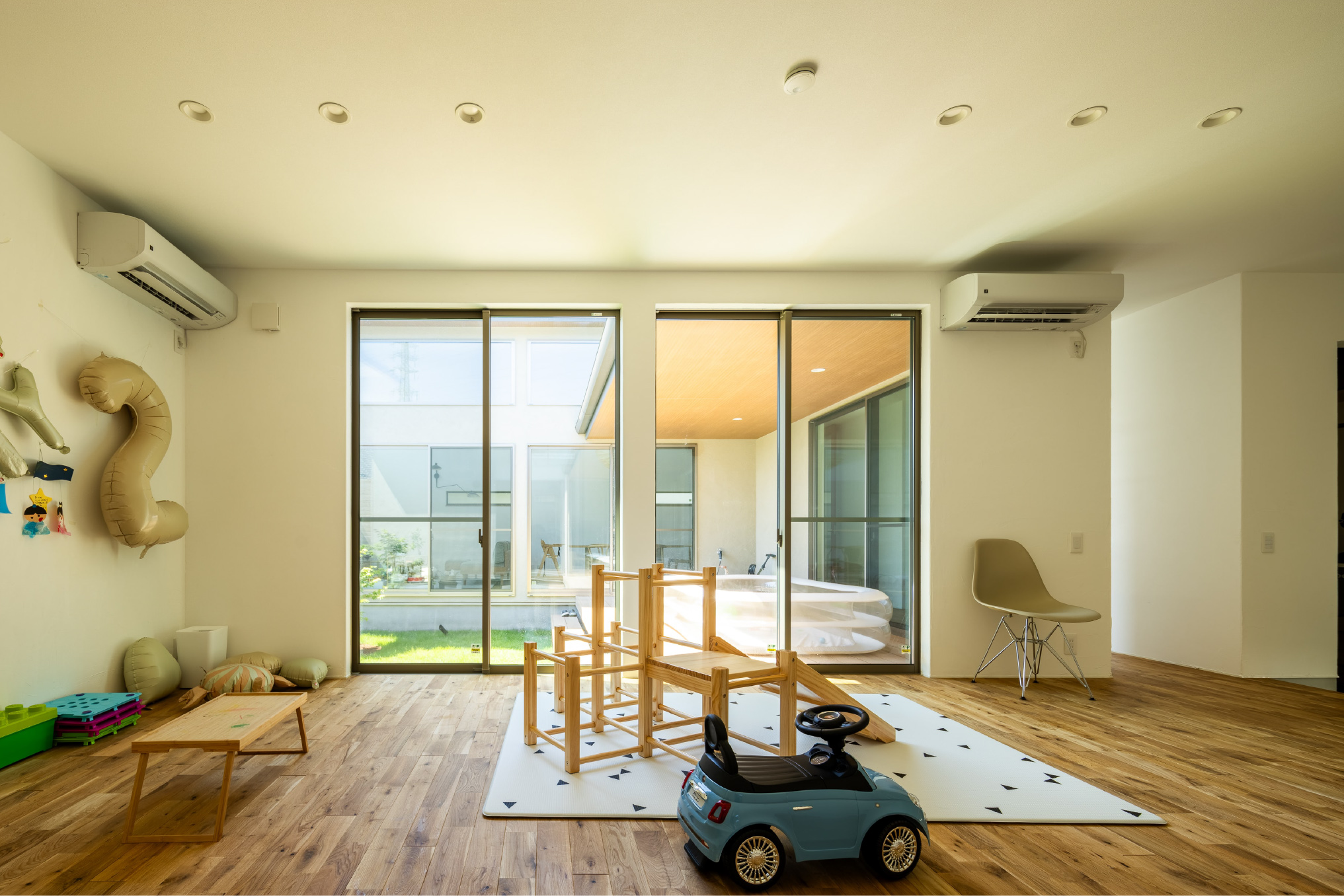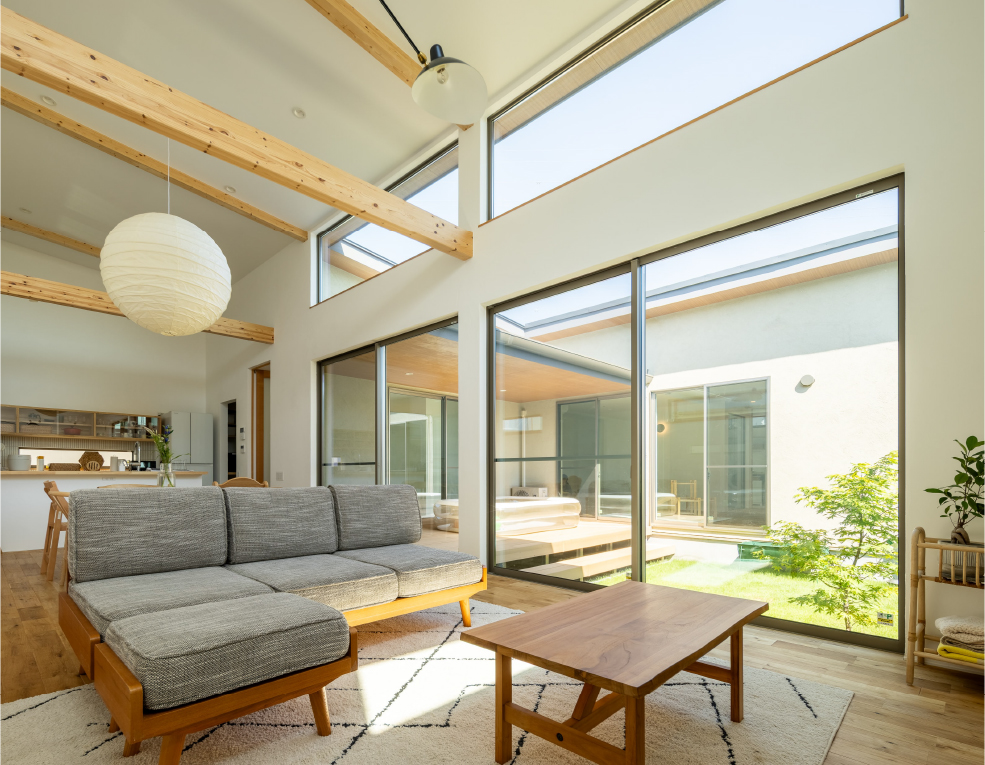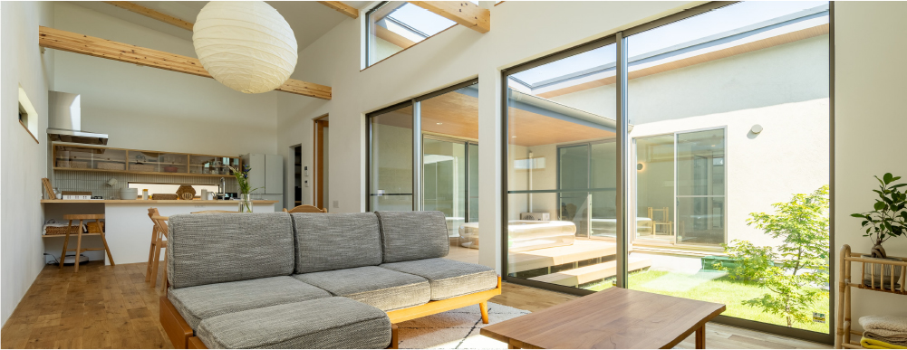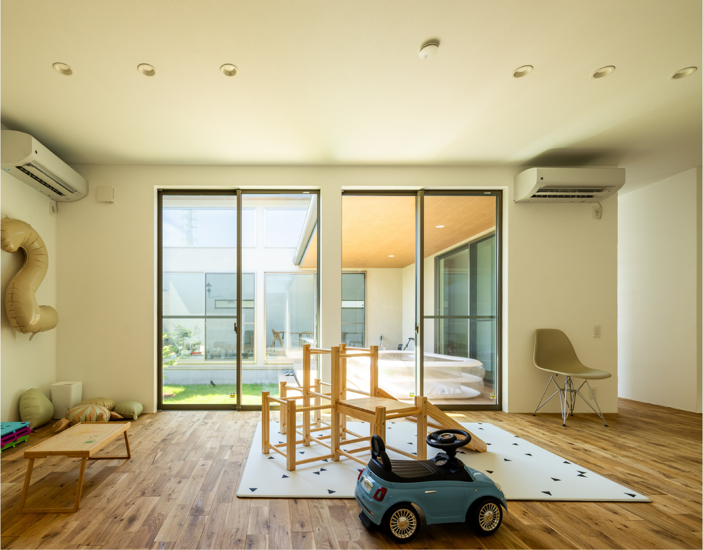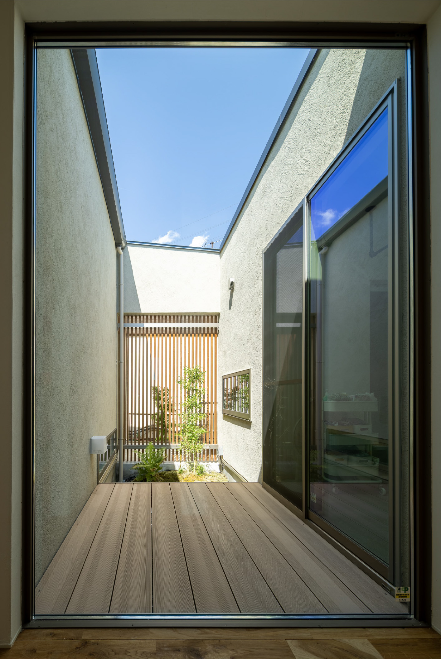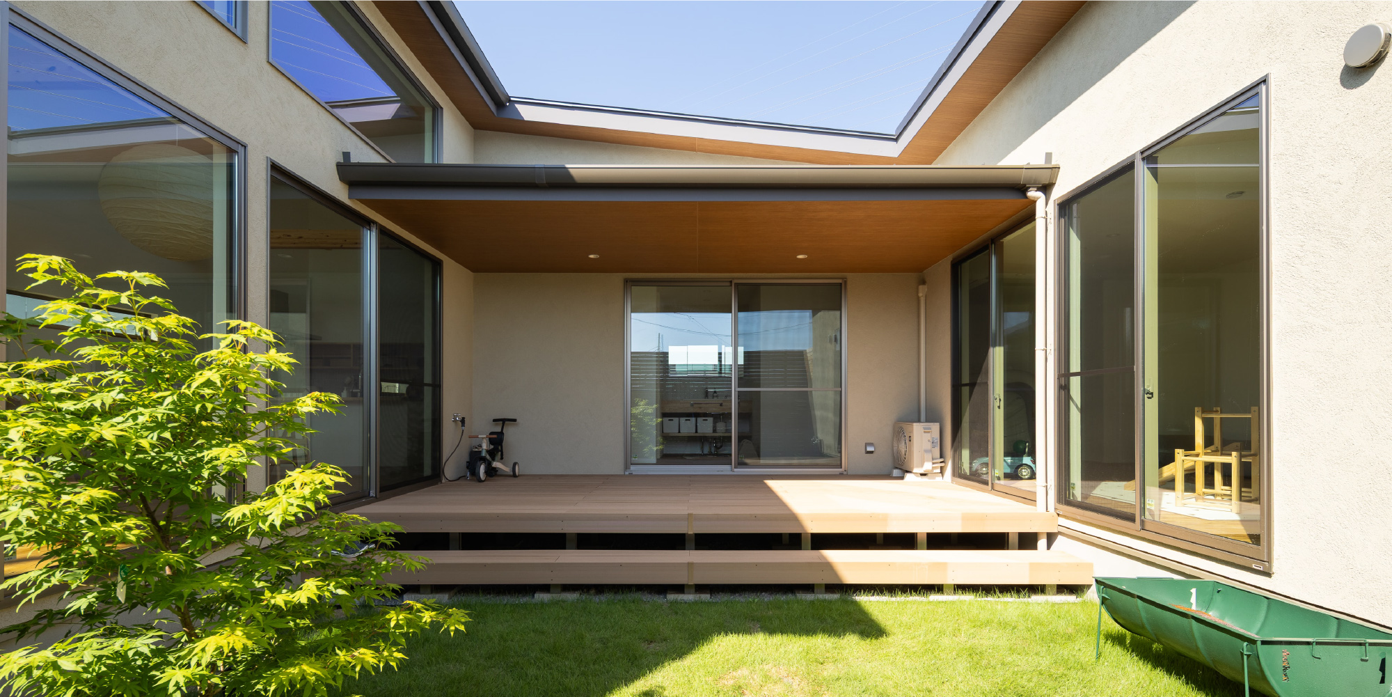 玄関近くの見て楽しめる小さな坪庭と、リビング横の子供が遊べる大きな中庭と、2つの中庭を設けました。それぞれの中庭の周りに色々な部屋を設けることで、どこからでも明るく開放的な空間になりました。ウッドデッキと土と半々の広い中庭には、大きな下屋(屋根)を作ることで夏の日差しを抑えつつ、雨の日でも洗濯物などを気にせず使える空間になっています。