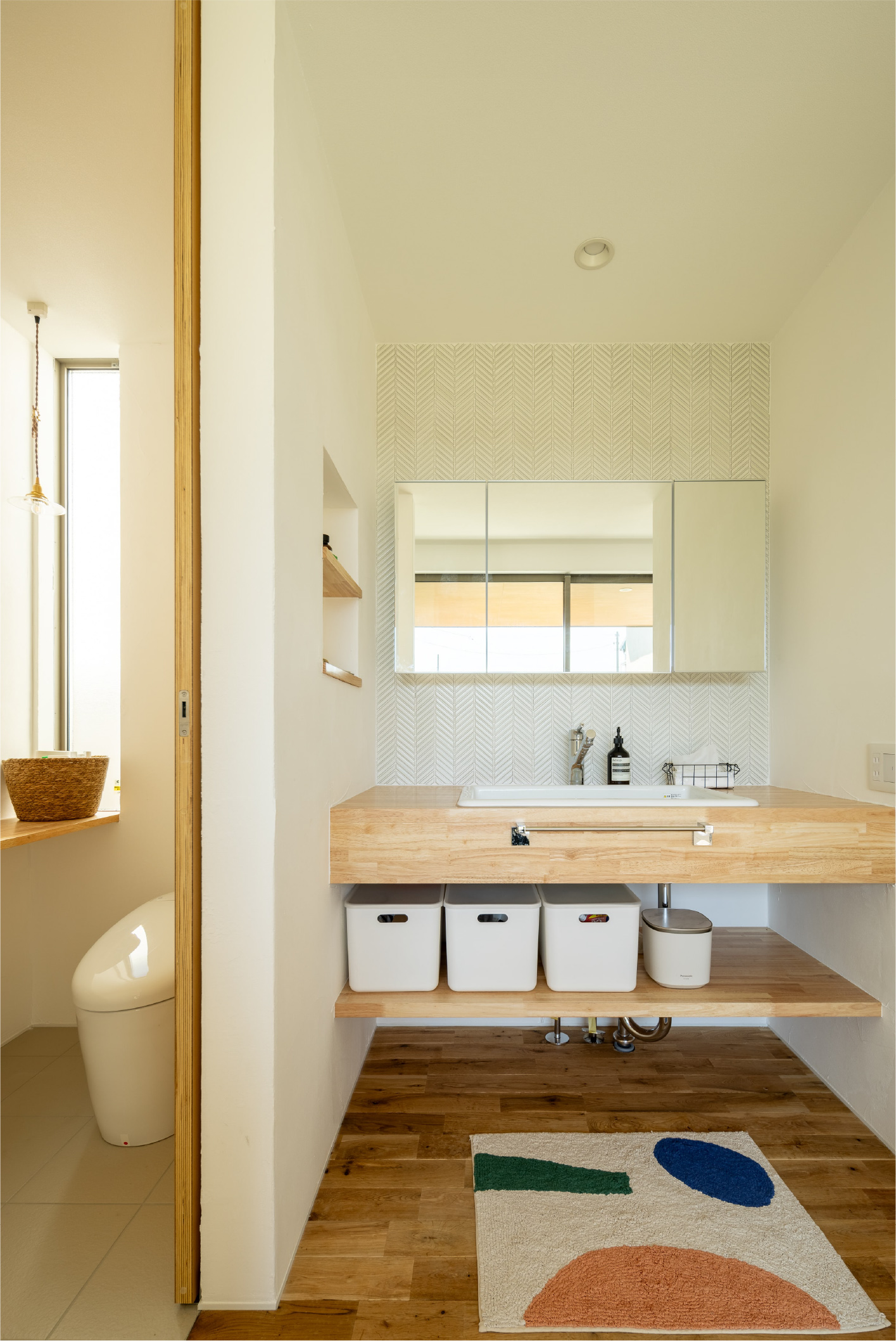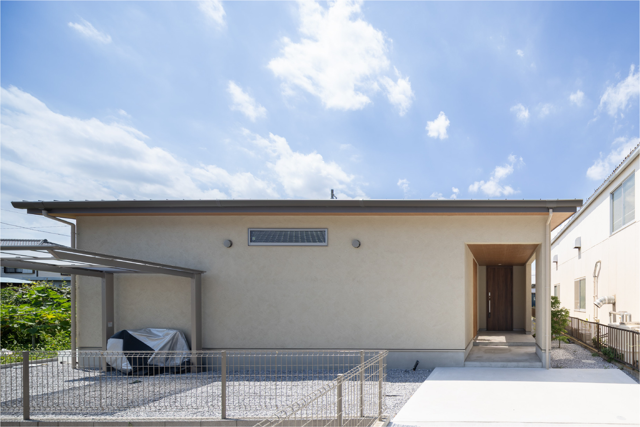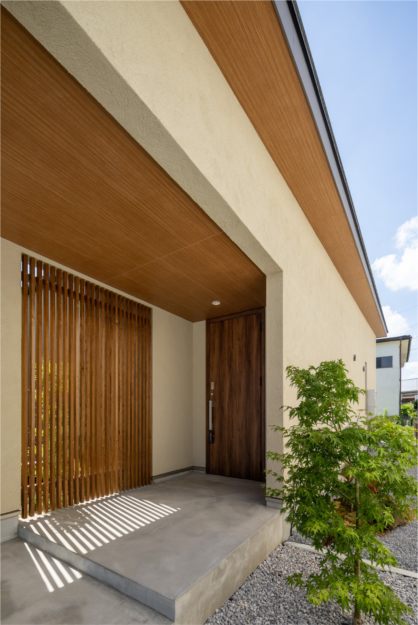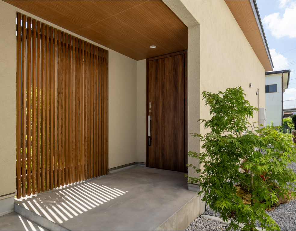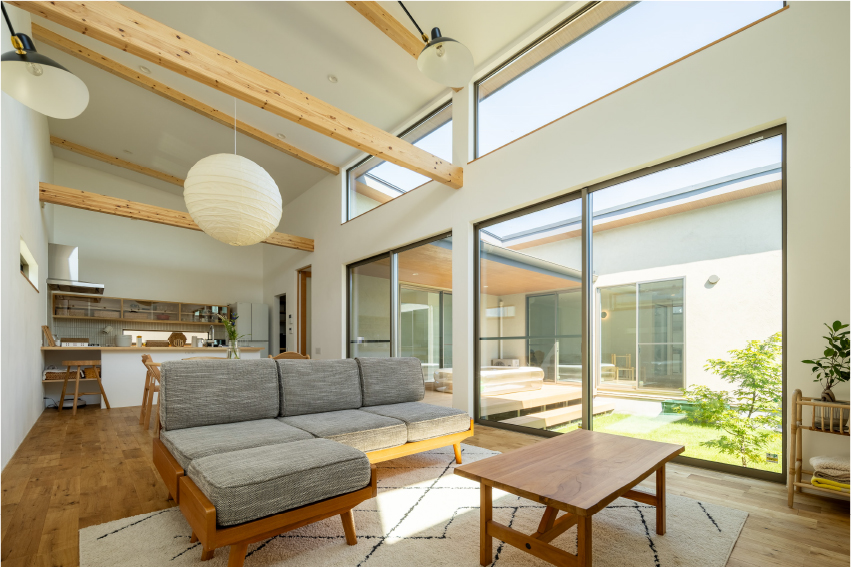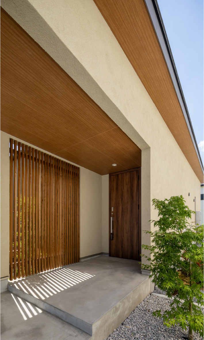 玄関近くの見て楽しめる小さな坪庭と、リビング横の子供が遊べる大きな中庭と、2つの中庭を設けました。それぞれの中庭の周りに色々な部屋を設けることで、どこからでも明るく開放的な空間になりました。ウッドデッキと土と半々の広い中庭には、大きな下屋(屋根)を作ることで夏の日差しを抑えつつ、雨の日でも洗濯物などを気にせず使える空間になっています。