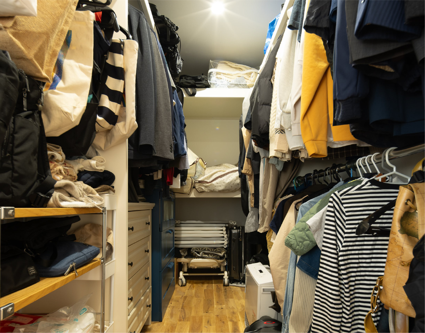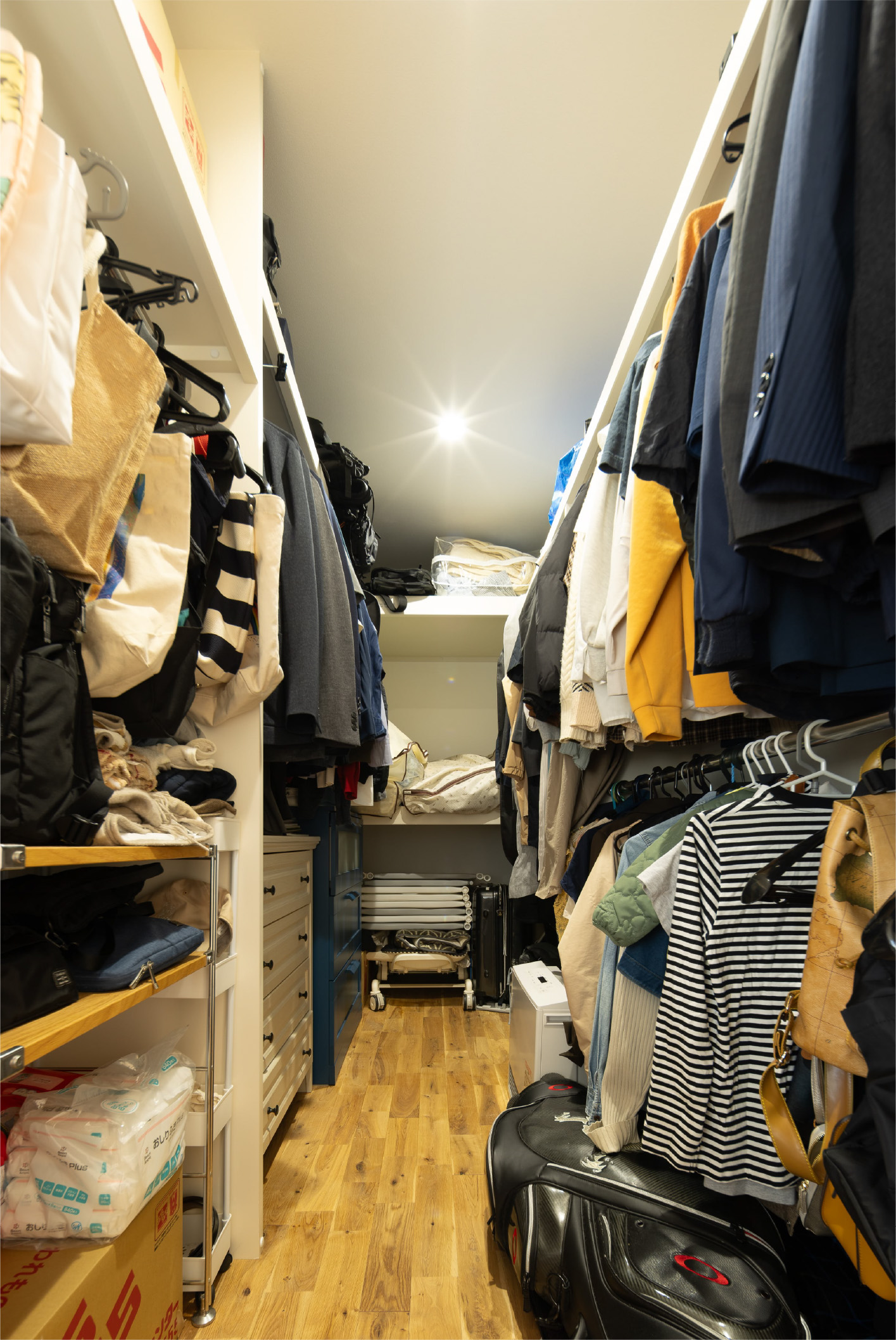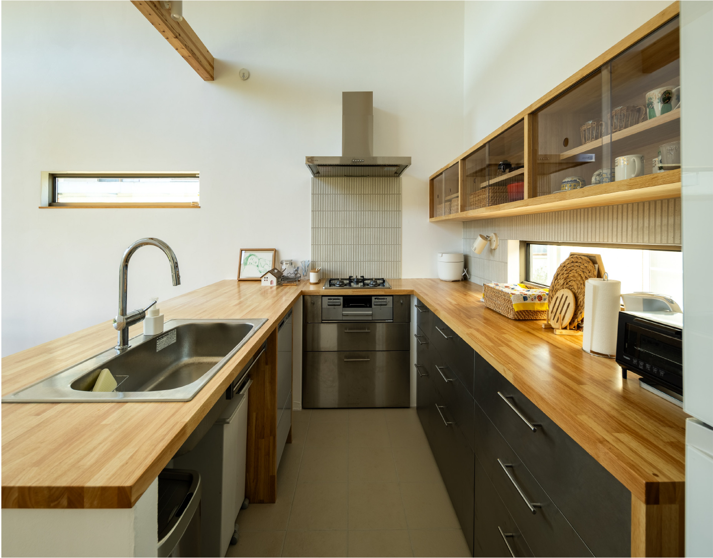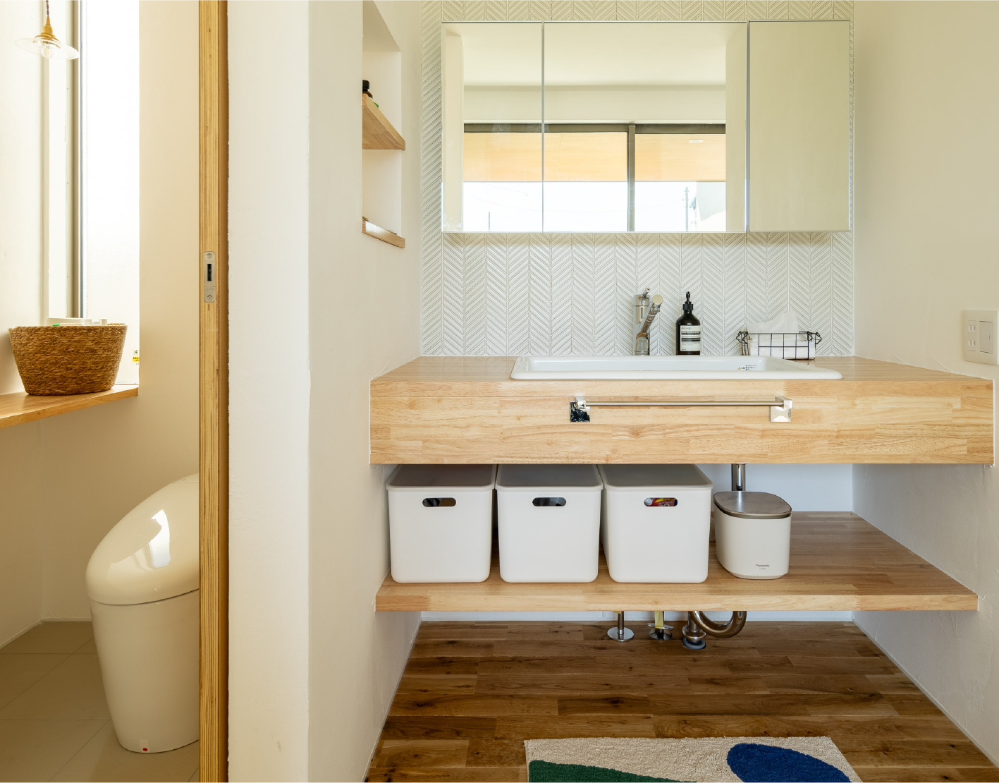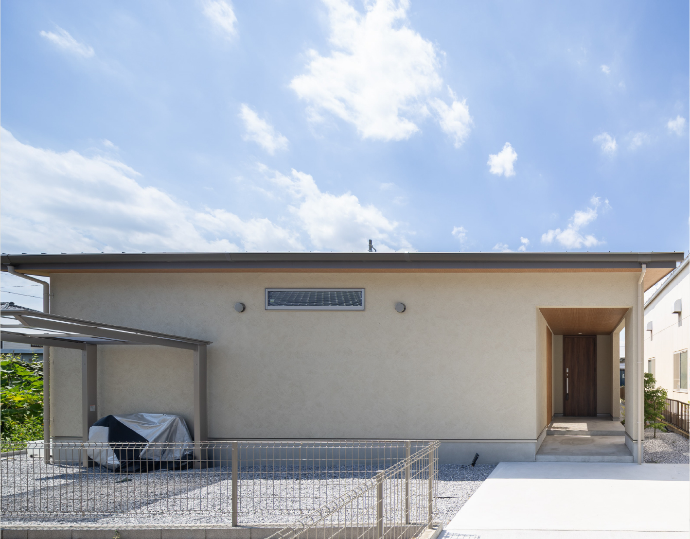 玄関近くの見て楽しめる小さな坪庭と、リビング横の子供が遊べる大きな中庭と、2つの中庭を設けました。それぞれの中庭の周りに色々な部屋を設けることで、どこからでも明るく開放的な空間になりました。ウッドデッキと土と半々の広い中庭には、大きな下屋(屋根)を作ることで夏の日差しを抑えつつ、雨の日でも洗濯物などを気にせず使える空間になっています。