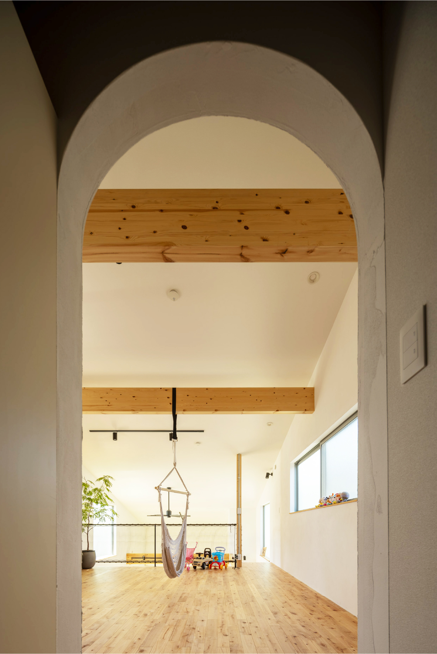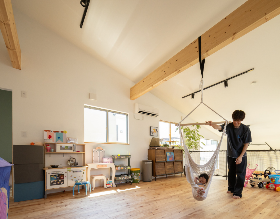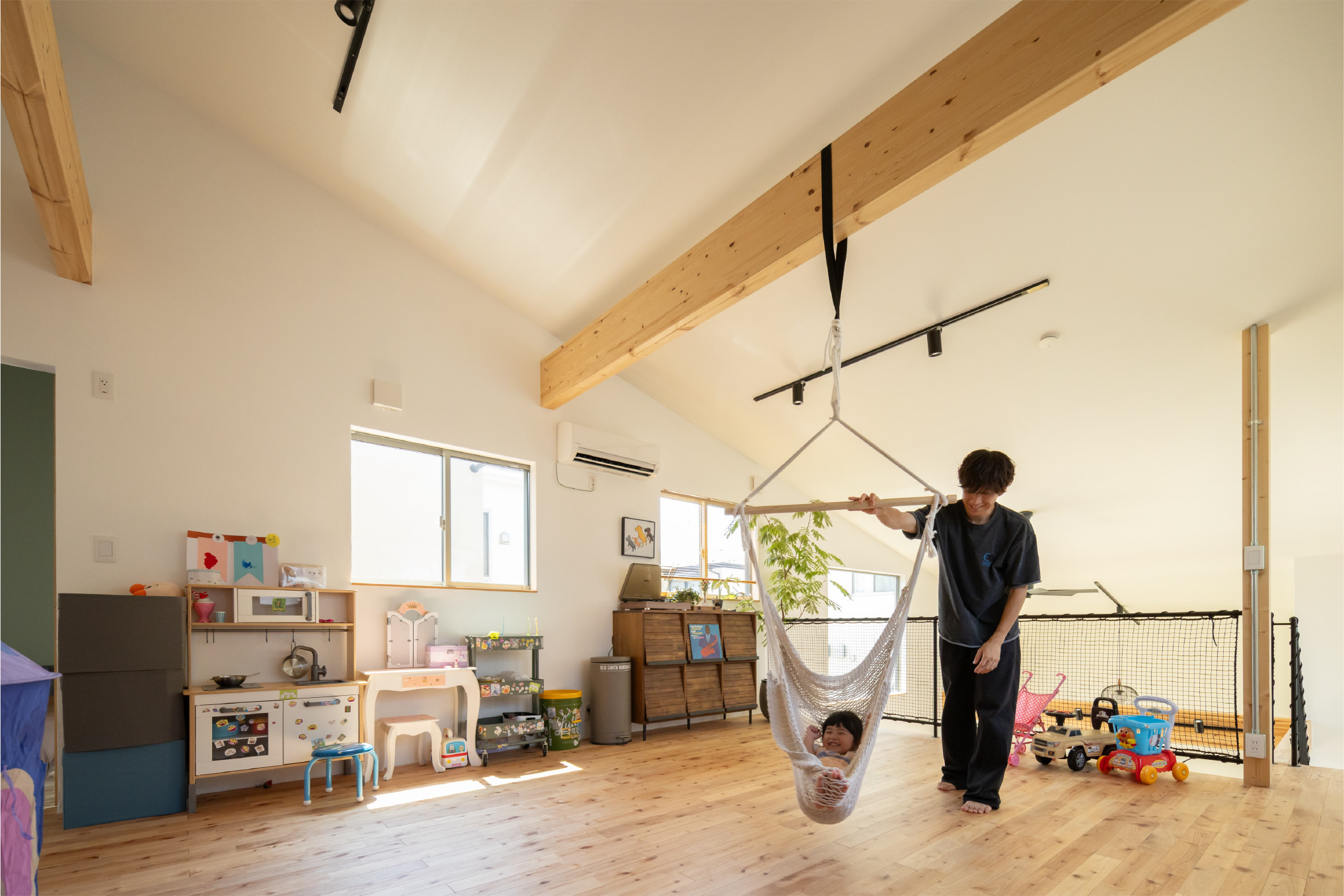 駅前の狭小住宅からの住替えのお客様です。前の住宅の反省を踏まえて、子供たちが走り回れる広くて明るいリビングと中庭を設けました。また子供部屋の間仕切りを無くす事で(時期が来たら施工)、2階も大きな遊び場になっております。また玄関正面は窓をなくし、プライバシーを配慮しつつ中庭を大きくとることで、室内は明るくて開放的な空間になりました。