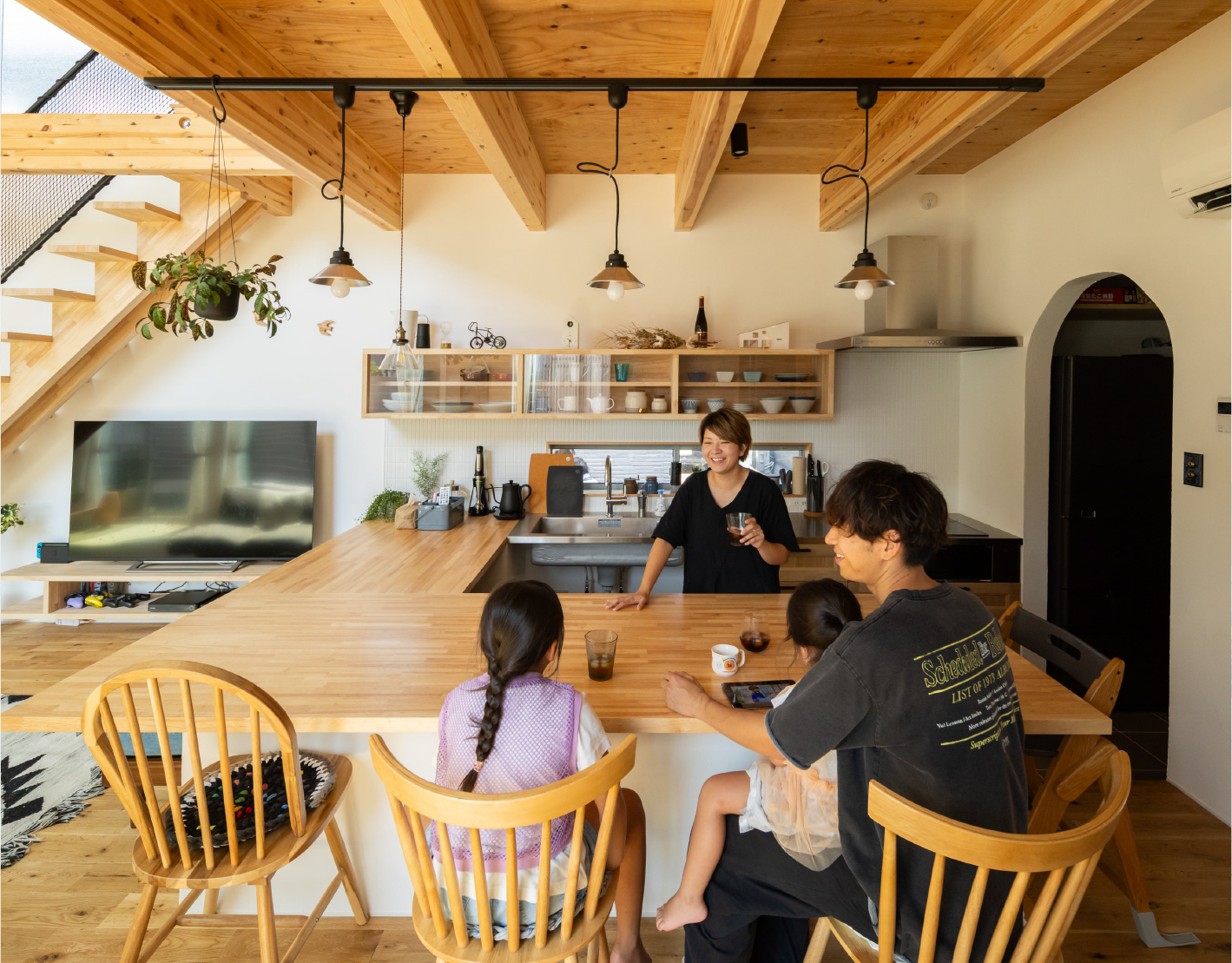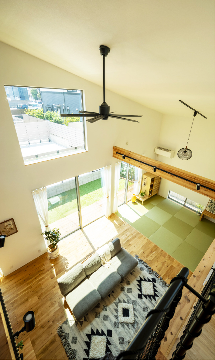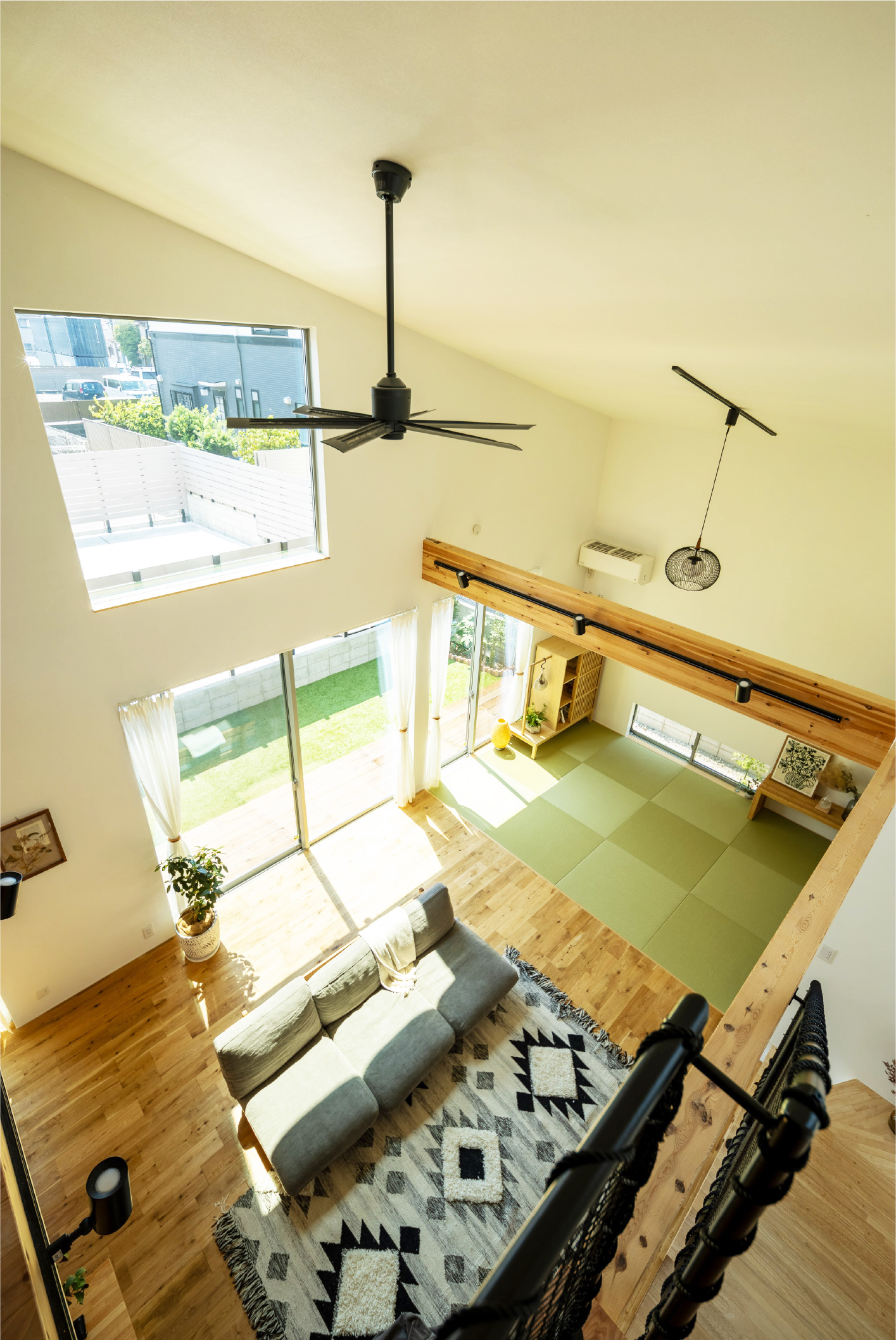 駅前の狭小住宅からの住替えのお客様です。前の住宅の反省を踏まえて、子供たちが走り回れる広くて明るいリビングと中庭を設けました。また子供部屋の間仕切りを無くす事で(時期が来たら施工)、2階も大きな遊び場になっております。また玄関正面は窓をなくし、プライバシーを配慮しつつ中庭を大きくとることで、室内は明るくて開放的な空間になりました。