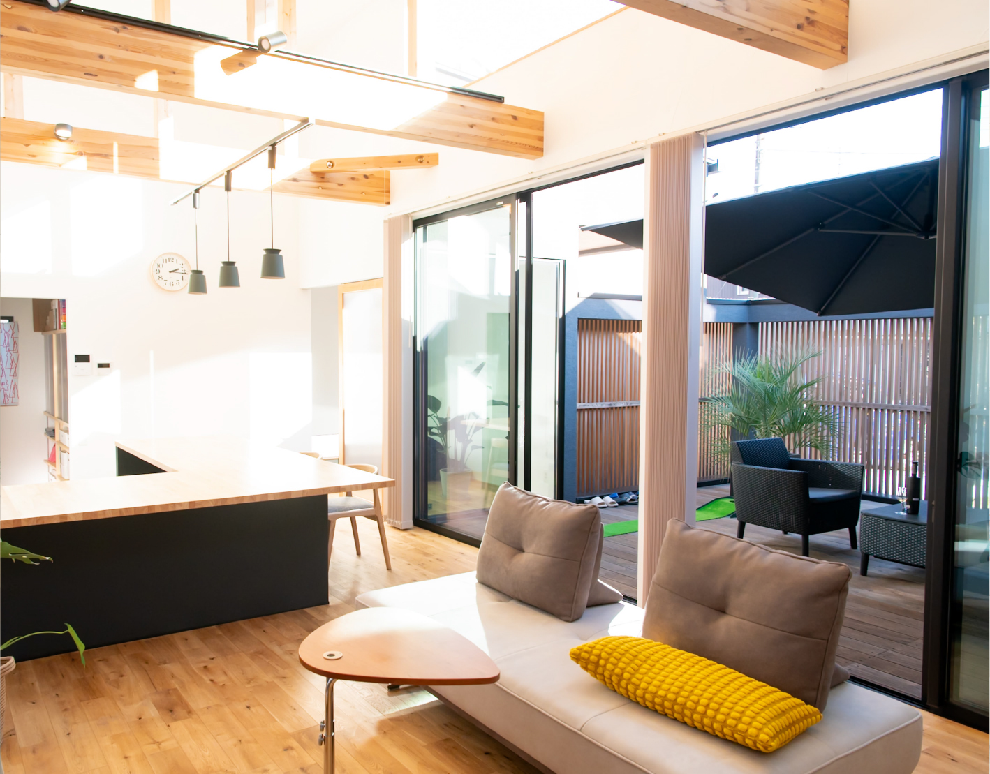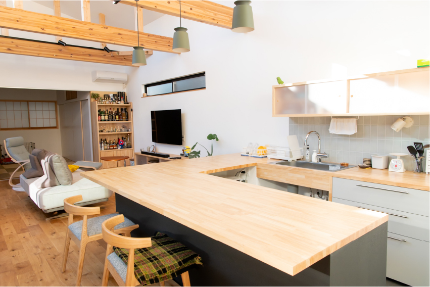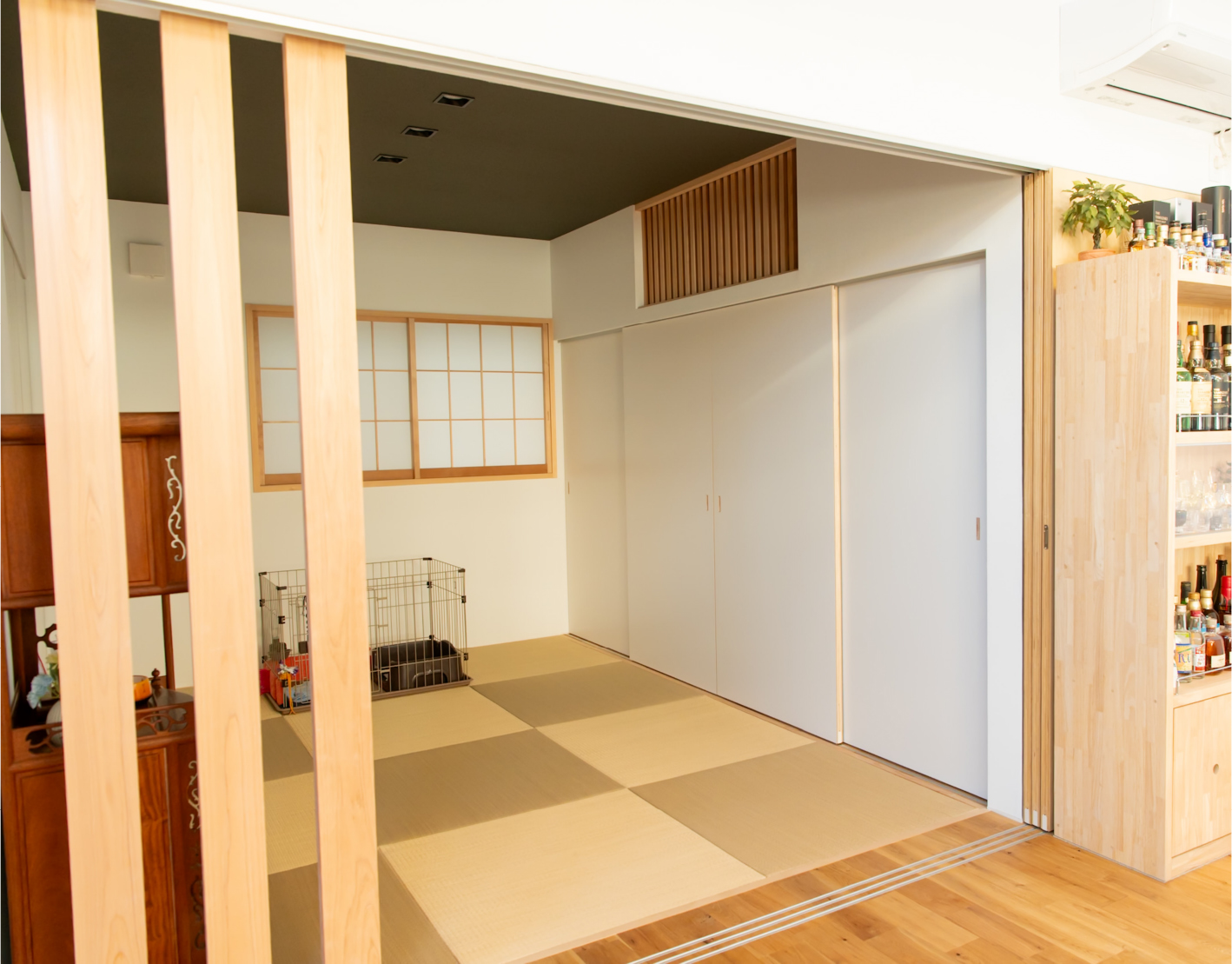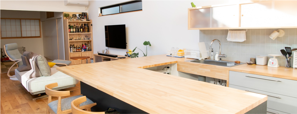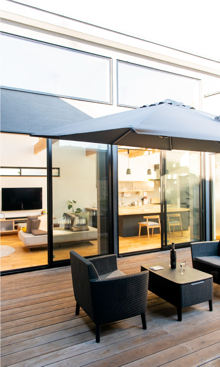 格子で外とつながる大きな中庭と、家の奥に小さな坪にはと二つ設けました。大きな中庭はリビングや寝室に面して、一体感のある明るく解放的な空間になりました。小さな中庭はお風呂や洗面所に面し、プライバシーを保ちつつ外を感じられる空間になっています。また夫婦二人暮らしのために、水回りと寝室をつなげることで、コンパクトで使いやすい回遊動線になりました。