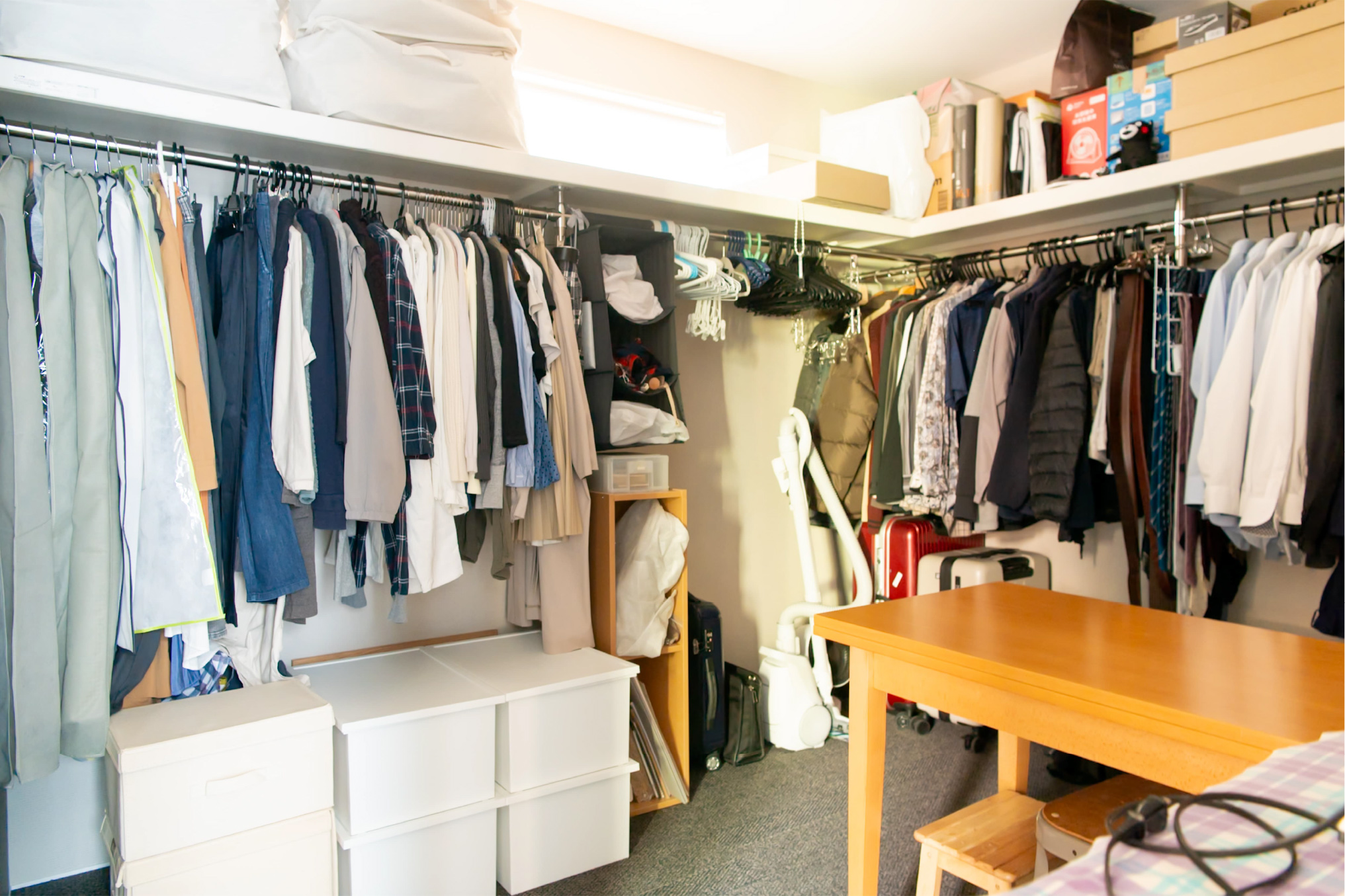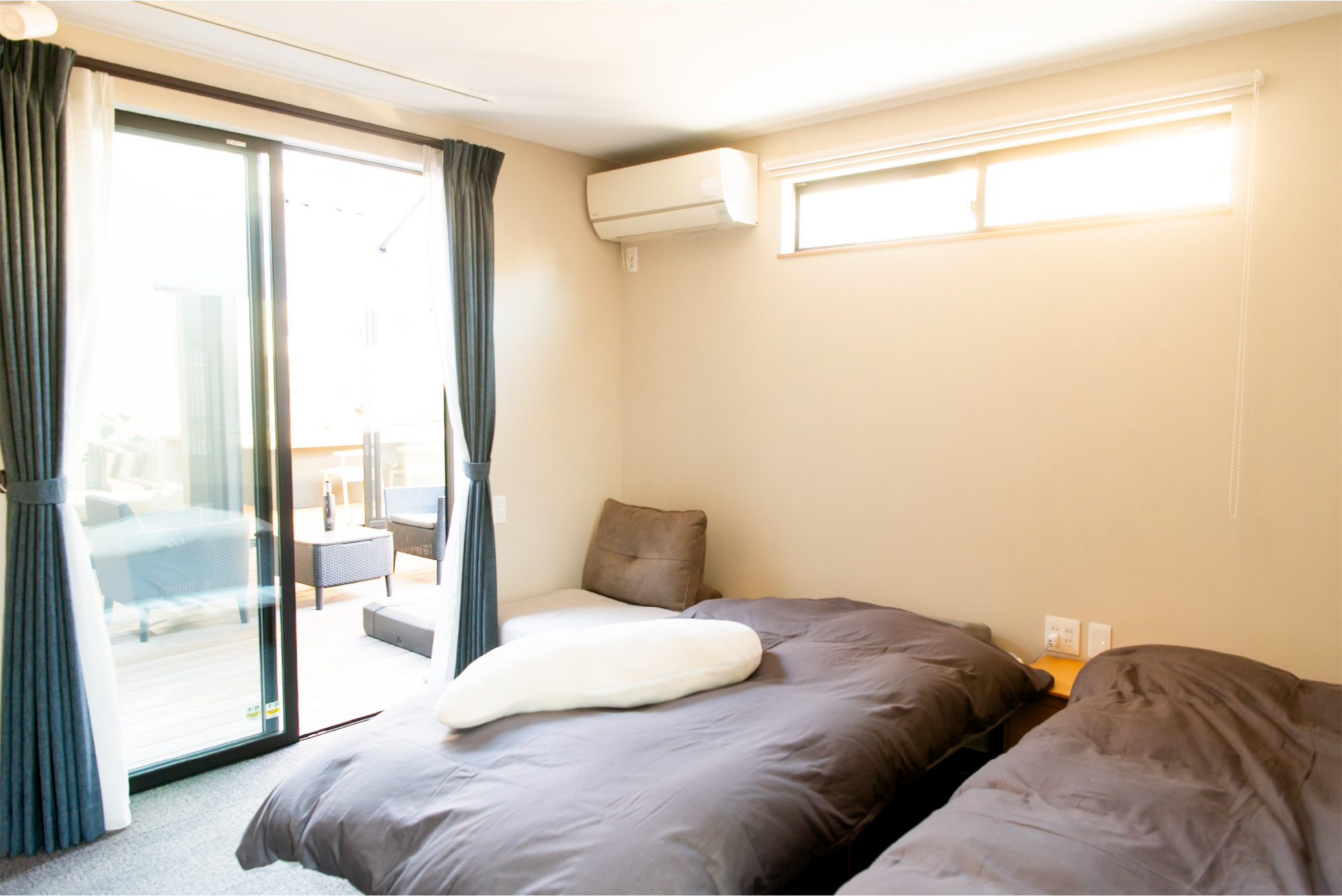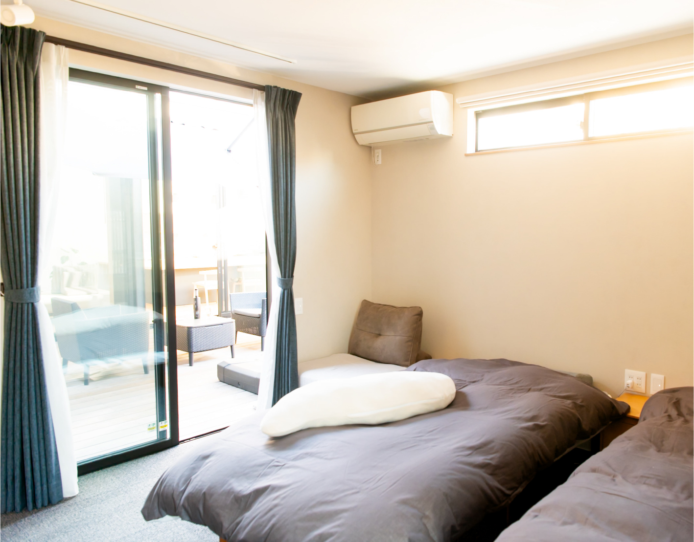 格子で外とつながる大きな中庭と、家の奥に小さな坪にはと二つ設けました。大きな中庭はリビングや寝室に面して、一体感のある明るく解放的な空間になりました。小さな中庭はお風呂や洗面所に面し、プライバシーを保ちつつ外を感じられる空間になっています。また夫婦二人暮らしのために、水回りと寝室をつなげることで、コンパクトで使いやすい回遊動線になりました。