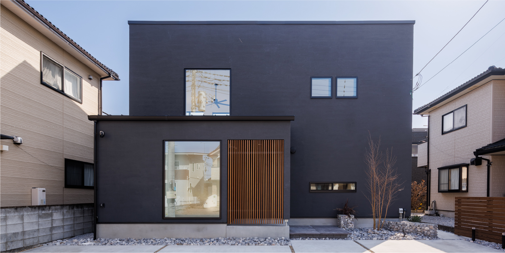 ブラックの塗り壁に木製格子を組み合わせた外観。