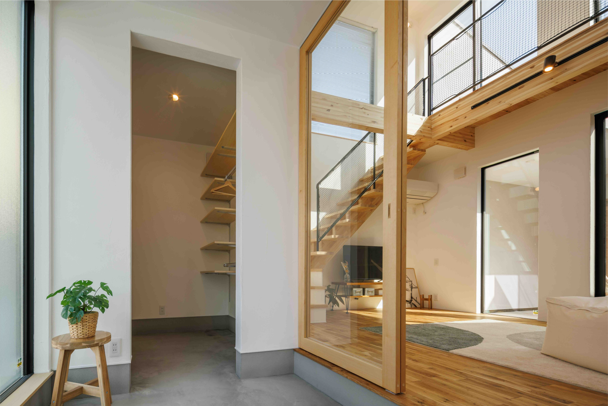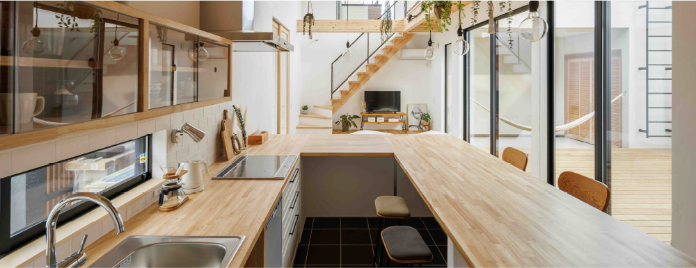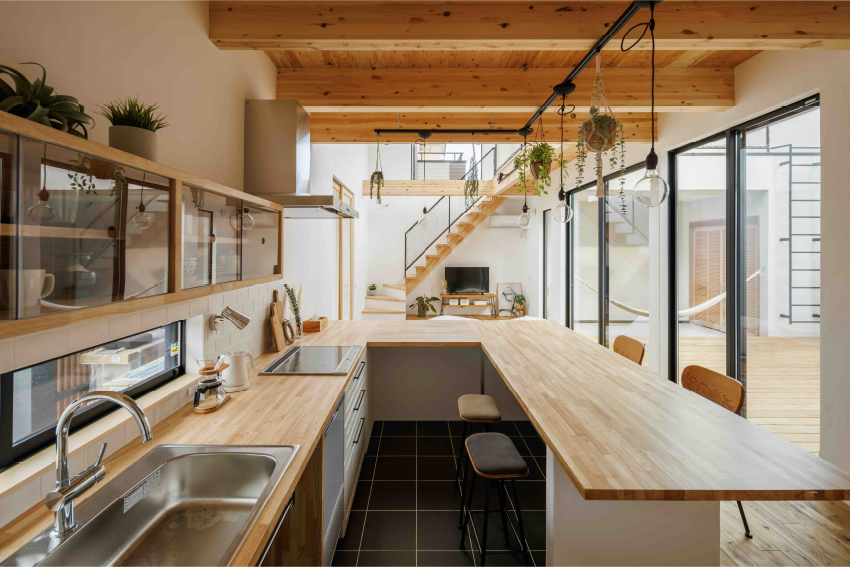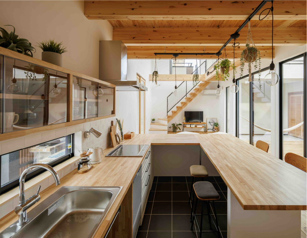 中庭をコの字に囲む間取りで、住宅街でも周囲の視線を気にすることなく、外との繋がりや開放感を感じられます。